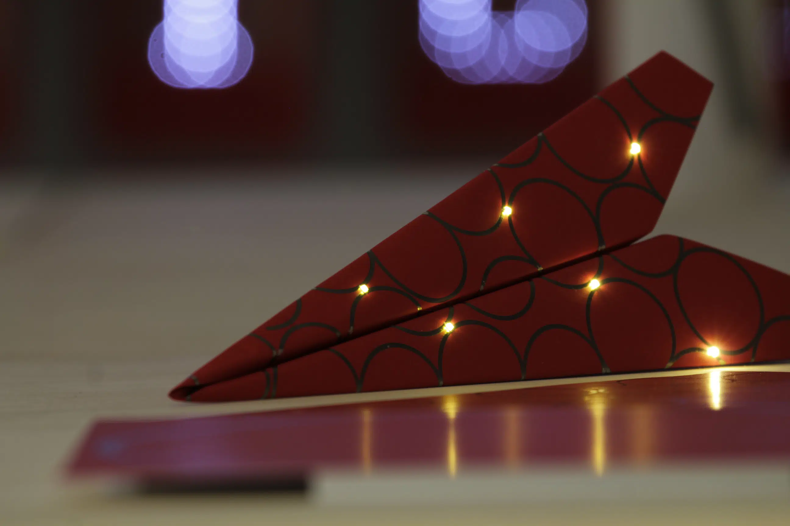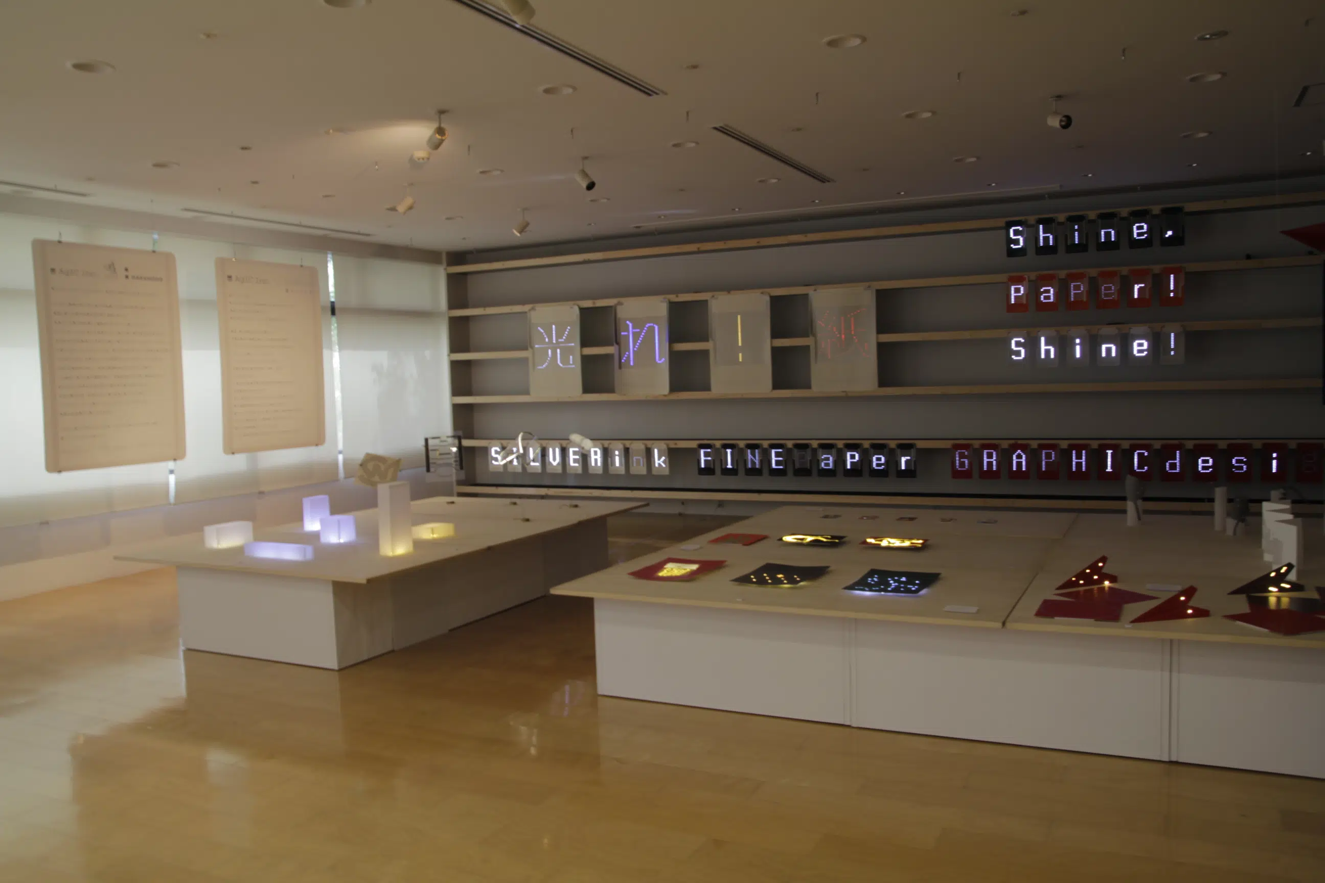 今回の展示では紙の新しい可能性を探るべく、「電気」が通るインクを使い、「光る」紙の作品を展示します。