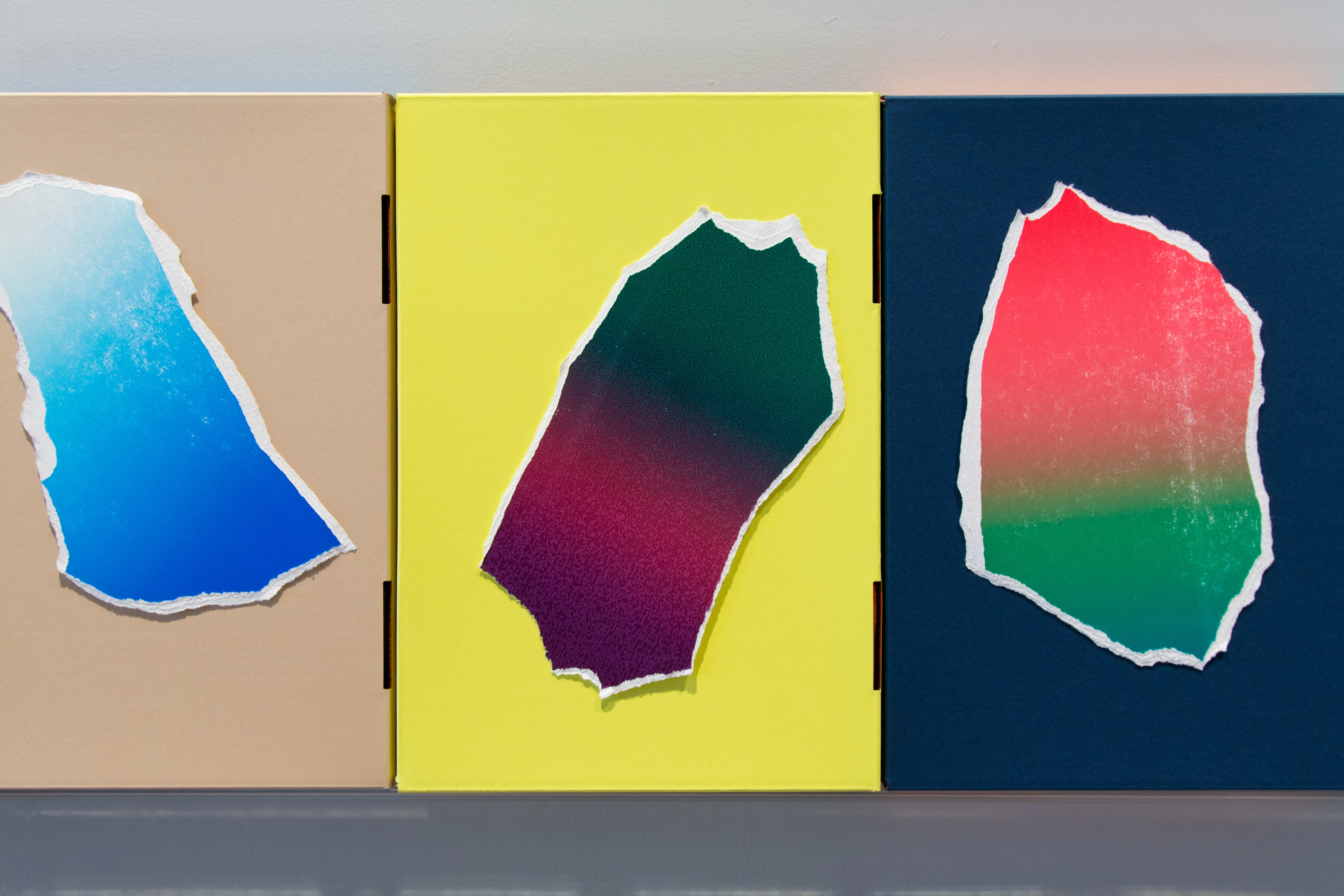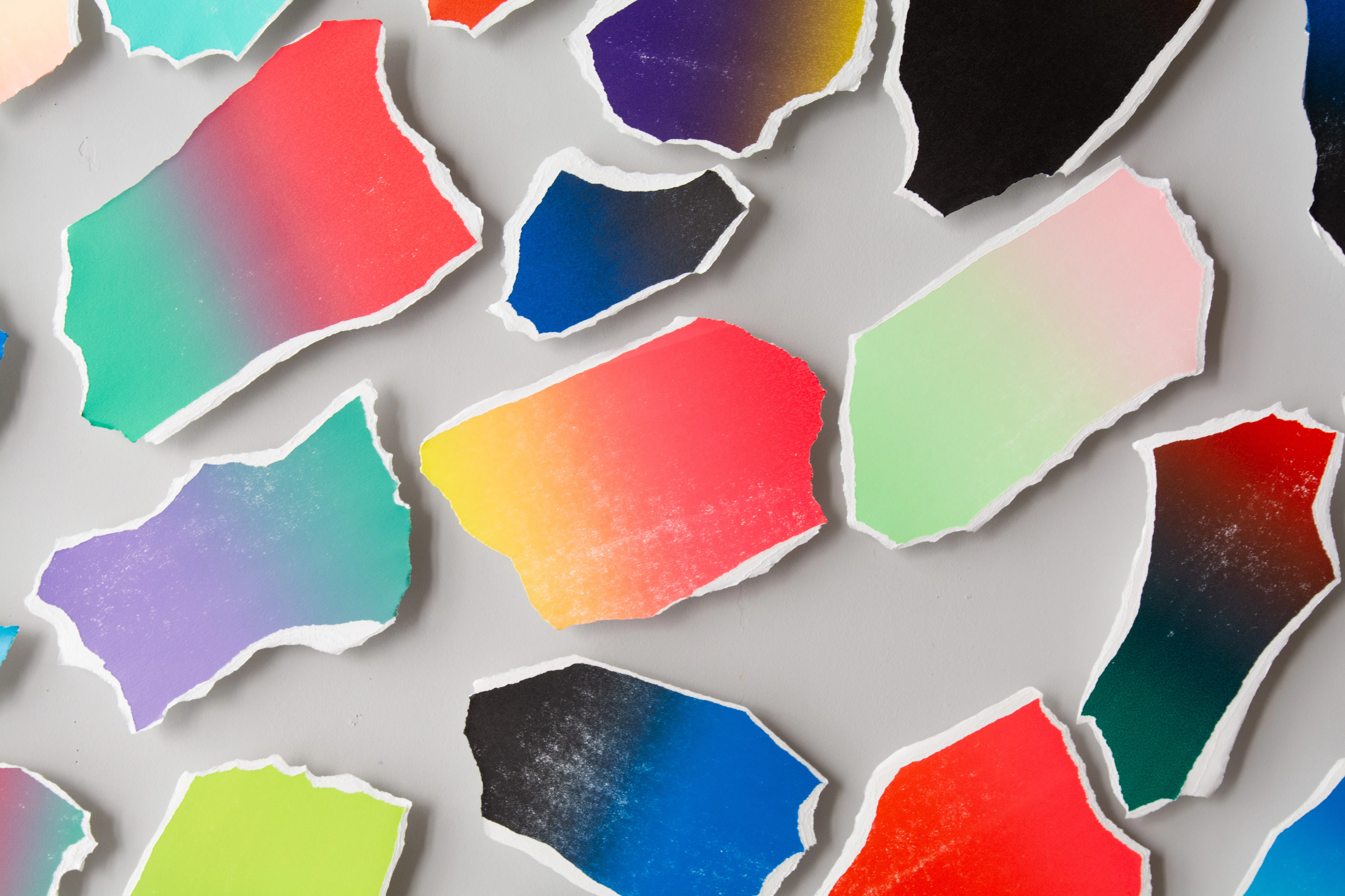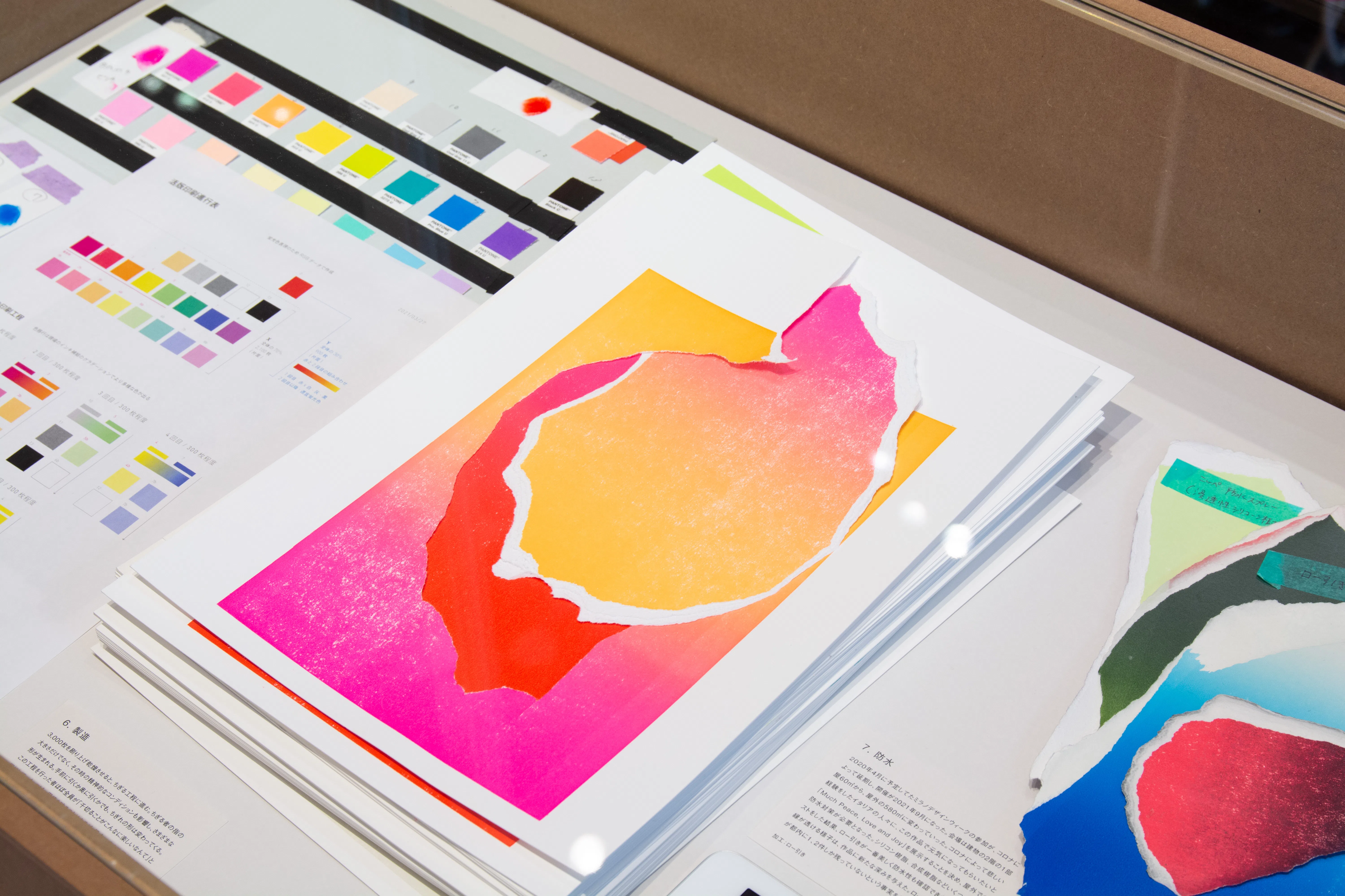 特殊な活版印刷により一つとして同じものがないグラデーションを印刷し、1枚1枚手で千切った紙の断片を集積した