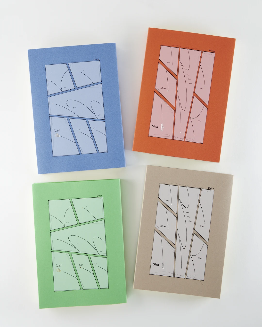 鉛筆描きのラフのような線はスミ1色、枠線や曲線、「La!」「Sha~」といったオノマトペの部分は黒の箔押しにすることで、