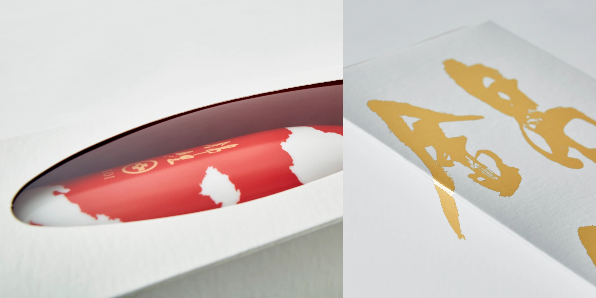 箱の紙は「気包紙 C-FS」。日本の上質さを感じてもらうためには白くて手触り豊かな紙がいいと、最初から気包紙に決めていたんです。海外に輸送するので、汚れが付きにくいことも大切なポイントでした。些細な部分ですが、注目してほしいのが箱の角。箔を押してから角を折っているのに、角割れが全然ないんです。これによって筆文字をわずかに外側に出すことができ、デザインに張りと緊張感が生まれました。依頼から完成までにかかった期間は約二年。今代司酒造さんのビジョンが最初からはっきりとしていて最後までぶれなかったからこそ、長い時間をかけて細部を丹念につくり込みながら、必然のかたちにたどり着けたと感じています。