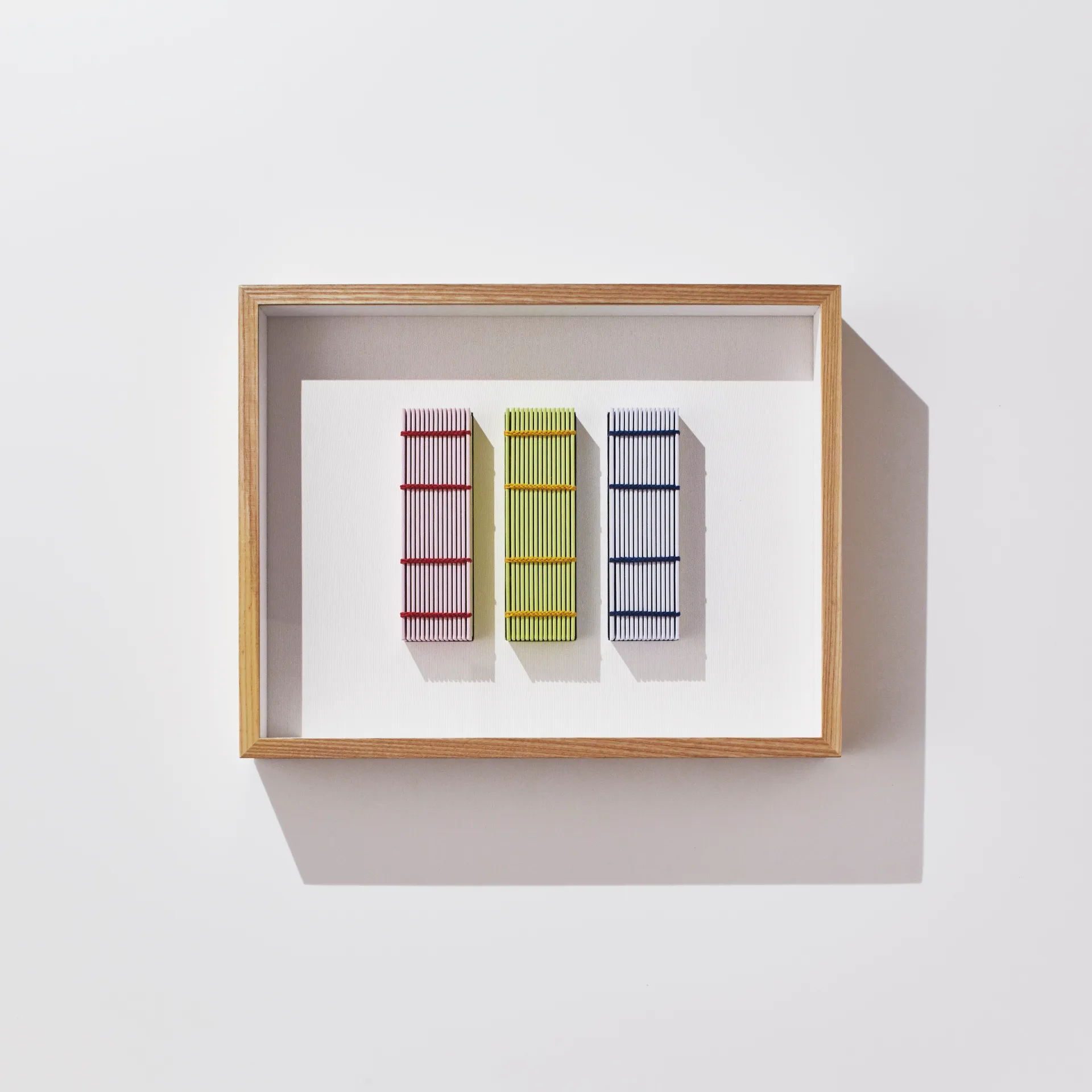 もともとテキストがあってそれを読者に届けるために行うブックデザインに対して、ブックアートは、テキストやグラフィックやタイポグラフィ、綴じ方などの要素を構成し、それらがひとつに交わることで、あるひとつのコンセプトを体現するものというイメージで捉えていただければいいと思います。紙もそのうちの重要なひとつの要素です。 額装の「Book-Composition」シリーズは、本を空間に配置するという行為として考えた作品です。額に入れたのは、絵画のように壁に“掛ける”という行為が発生することを狙っています。(続く)