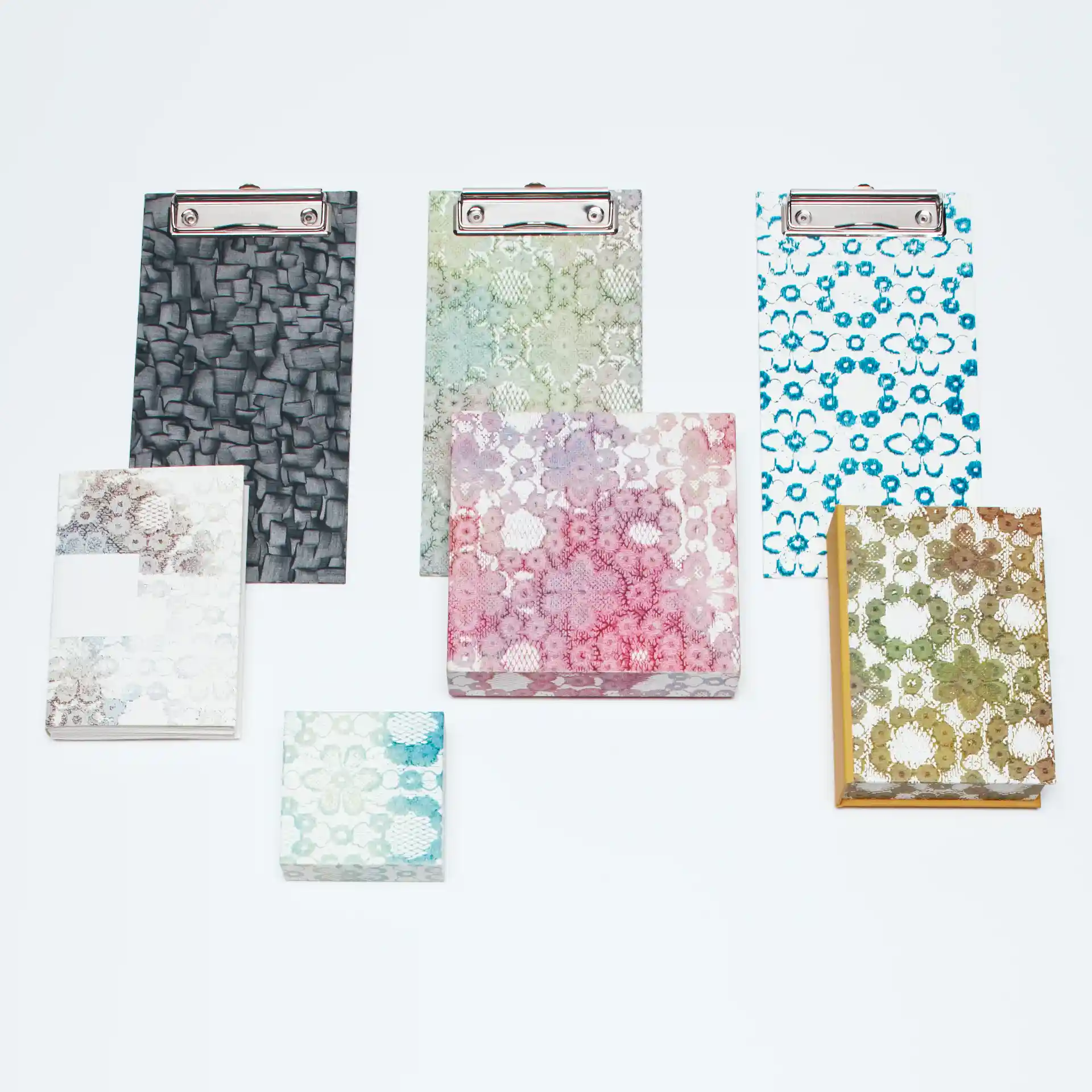 以前ドイツへ留学した際は、手製本の勉強の一環として紙を染める技術を学びました。クライスター・パピアやマーブル染め、コート紙を染める技術などです。帰国後、クライスター・パピアを染めるのに最初に求めた材料が紙です。ドイツで使っていた紙に近い、表面にレイドや質感のある紙の中から、ふっくらと嵩があって柔らかい100kg前後の厚みのものを選びました。実際には、使ってみなければクライスター・パピアに適しているかを判断するのは難しかったです。竹尾の紙はいろいろと試していて、ストラスモアライティングレイドベルクール……NTラシャも染めやすいですね。水を使うので、なるべく伸びの少ないものが良いのですが、水を含んで伸びている状態であっても破れにくい、丈夫な洋紙が向いています。グムンドカシミアも染めやすい紙のひとつです。基本的に非塗工紙ならどれも染められますが、私たちはレイドが入っている紙を気に入って使っています。レイドが横に入っているために、交差する縦の刷毛目がきれいに出るからです。また、糊も良くのります。私たちは、幼い頃から文房具が大好きでしたので、クライスター・パピアを製本用にだけでなく、箱やノート、ホルダーなどの文房具に生かし、広げたいと考えました。寺園が加工、森住が染めと分担することが増えてきましたが、紙染めは二人でする方が楽しいです。今春から発売されているタンゴの巨匠ピアソラのクリスタルCDは、外側の箱をツヴィリンゲがつくっています。これからも機能的で美しいプロダクトをつくり続けていきたいですね。