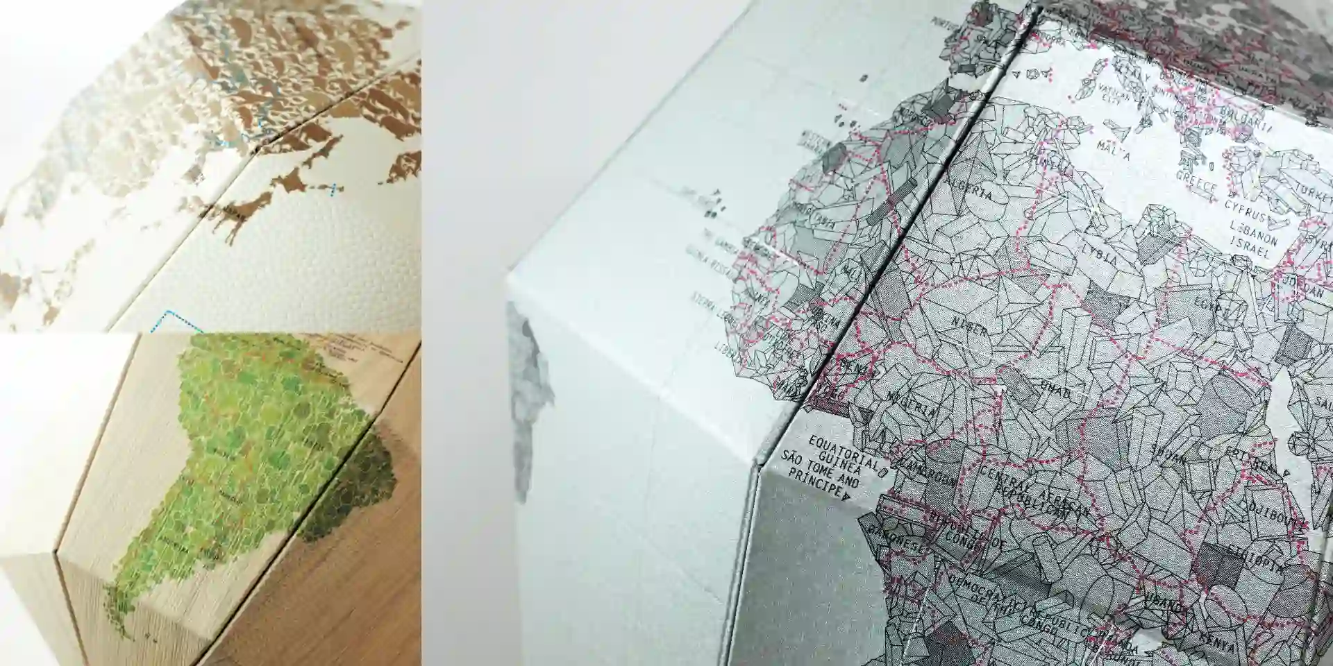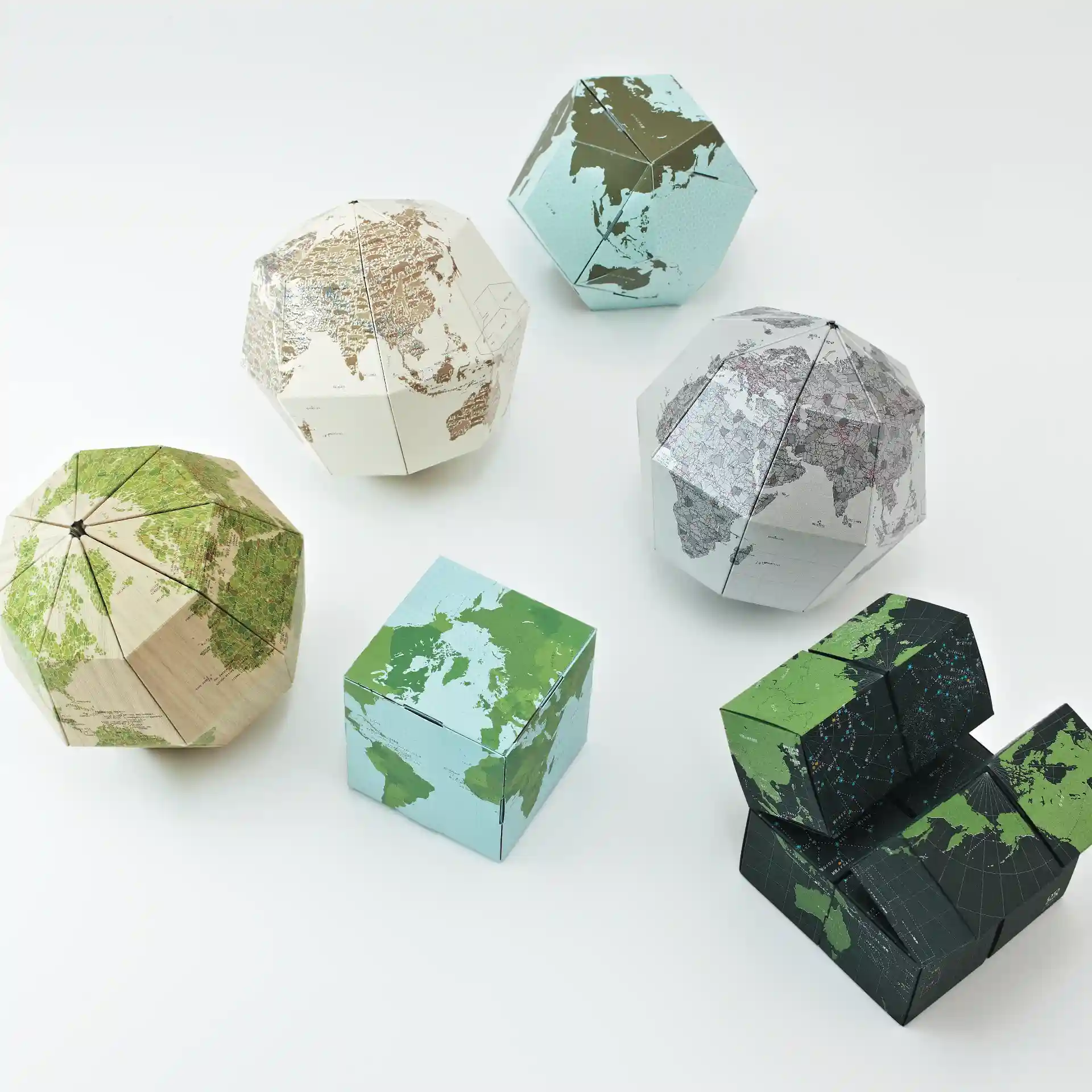 プロダクト上で多くの印刷技術を見せるべく、まずは色々な印刷に応用できるフォーマットをデザインしようと考えるうちに、地球儀を思いつきました。印刷は情報を伝える技術なので、プロダクトにしたときもその要素は持たせたかったんです。地球儀なら地理や地形をテーマに様々なバリエーションが展開できるし、表面に情報を埋め込めばグラフィックと造形だけでそれを伝達できると思い、高い可能性を感じました。「SECTIONAL GLOBE」の「MATERIAL」シリーズは地球上のさまざまな素材をテーマにしています。このシリーズは手の中で見て楽しめるようなサイズのものにしたかったのですが、そうすると見る距離も自然と近くなるので、紙選びではテーマとの兼ね合いはもちろん、質感や触り心地にもかなりこだわりました。今回の新作の「TWISTABLE GLOBE」と「FLIPPABLE GLOBE」はオーサグラフ世界地図を開発した鳴川肇さんに参加を仰いでできたものです。どちらも組み立て式かつ変形できるものなので、何種類もの紙で試作して、印刷適性だけでなく弾力やコシ、表面の平滑性、厚み、操作性などを入念に検証しましたね。NTラシャを使った「FLIPPABLEGLOBE」は海洋部分にだけUV印刷で透明インキを刷ったのですが、もともとこういう模様の紙に大陸部分だけインキをのせたような、面白い風合いに仕上がりました。新作には「組み立てる」「見る」というだけでなく「遊ぶ」という側面が加わったので、今後はさらに印刷やグラフィックを発展させつつ、これらの地球儀を用いたワークショップなども開催できたらと思っています。