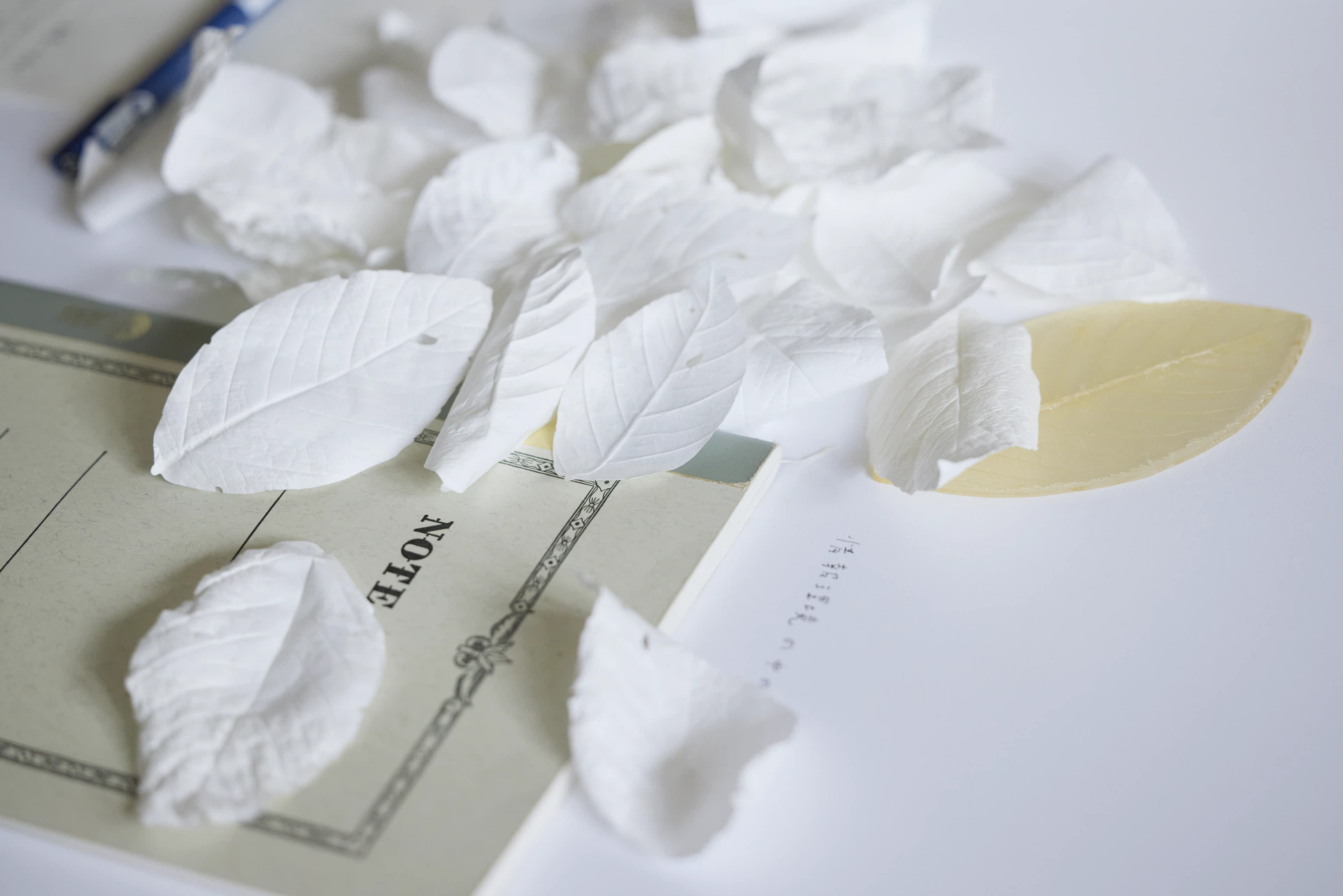 - 「鈴木さんが展示するものって、なんで白なんですか?」と聞かれることがあります。「葉っぱに色を付けた方がいい」という人もたくさんいて。基本的には素材をそのままの状態で使いたいのが理由で、はっきりとは答えられなかったのですが、「白にすることで人によって見える色や景色が変わる」と気づいて心が落ち着いたんです。たとえば「まばたきの葉」という作品では、白い葉に「目」が印刷されているのですが、上から舞い落ちる様子が冬だと雪に見えるんですよね。そうしたらある日、「韓国語で雪と目は同じヌンという言葉だ」と指摘を受けて、驚きました。白い紙のまぶしさに、人が自然から引き出した言葉の痕跡が刻まれているんじゃないかと思ったんです。白は、まぶしさや優しさを人に与える色なのかもしれなくて、そこにはすべての色、あらゆるものが含まれているんじゃないか。そういうものに触れられるというのは、よろこびそのものなのかなと。