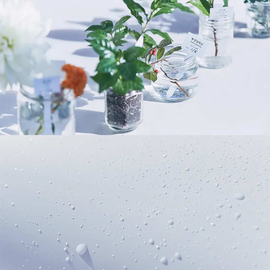 PETフィルムベースに耐水性の高いコーティングをしているため、水に濡れても安心です。写真のように花瓶に挿したり、屋外ポスターや屋外POPにしたりと、場所や天候等を選ばない多様な使い道を考えることができます。