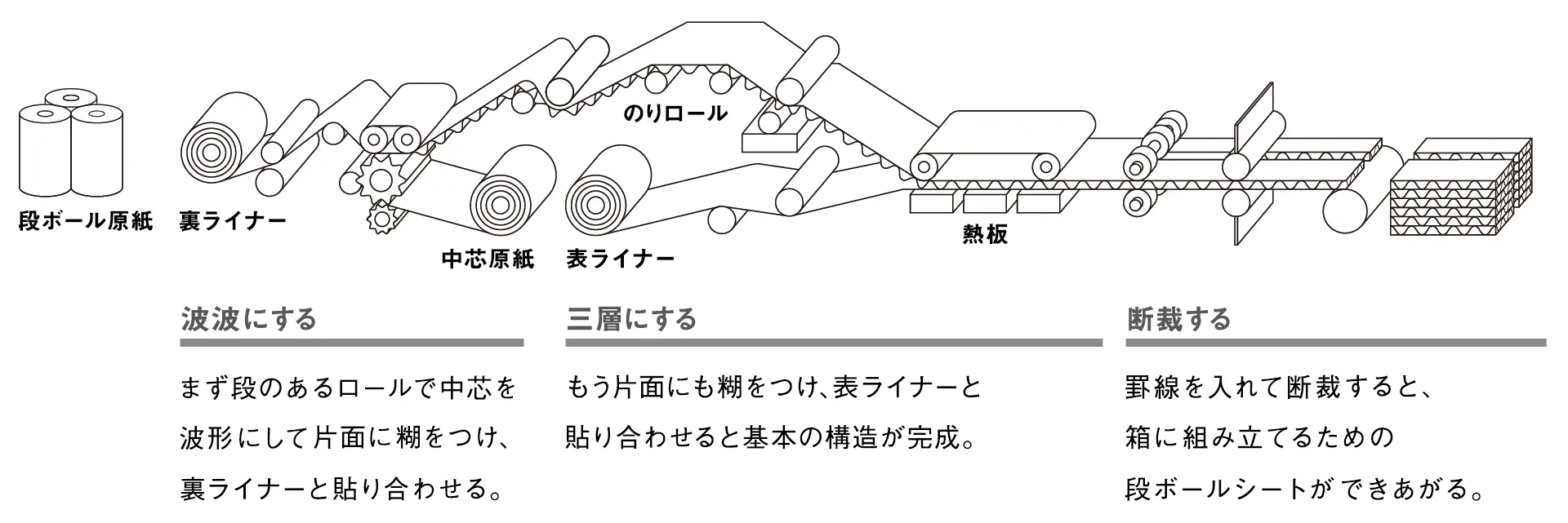 紙の種類や厚みを変えることで、段ボールの強度を調節できる。基本は3本のロールだが、ABフルートの場合には5本のロールで製造される。「ハレの段ボール、その成型」も製造工程は通常と変わらないが、素材にファインペーパーを使うことで色彩豊かな段ボールを生み出した。新しい段ボールの主原料は、使用済みの段ボール。かつて50%ほどだったリサイクル率は現在ではおよそ90%に。