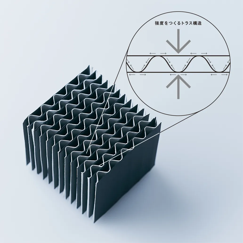 一般に段ボールは、中芯と呼ばれる波状の紙(フルート)を表裏の紙(ライナー)で挟んだ三層構造でできています。段ボールはフルートの高さによって種類が分けられており、必要な用途や強度に応じて選択されます。フルートによる隙間は一見頼りなく感じますが、実はこの波と波の連なりこそ、トラス構造という段ボールの強さの秘訣。受けた力を波の頂点を通して左右に分散させるので、強度と安定性を保つことができるのです。シンプルながら画期的なこの構造は、驚くことに、段ボールの誕生以来100年以上に渡って変わっていません。さらに、フルートを重ねたり、紙を変えることによって強度を緻密にコントロールすることも自由自在です。