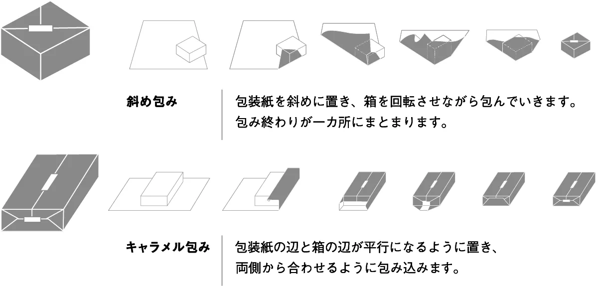 「斜め包み」は、祝儀と不祝儀で折り方が違います。祝儀は箱の「天」の位置に内側への折り目が重なります。そこには「幸せが上から入り、下から出ていかないように」という意味があるそうです。不祝儀は「地」の位置に内側への折り目が重なるようになっています。「不幸が下から落ちるように」との意味からだそうです。細やかな所まで気配りをする、日本人ならではの作法です。