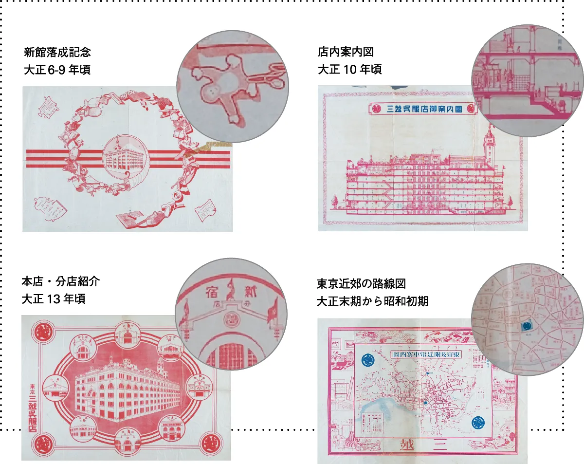 かつて包装紙は、コーポレートアイデンティティとしての役割のみならず、時には広告や情報媒体としての機能も果たしていました。館内案内図や東京近郊の路線図、度量衡法改正が施行された年はメートル尺貫法の早見表が印刷されたこともありました。ちなみに三越の現行の包装紙は、昭和25年のクリスマスの時に猪熊弦一郎画伯によってデザインされたものです。