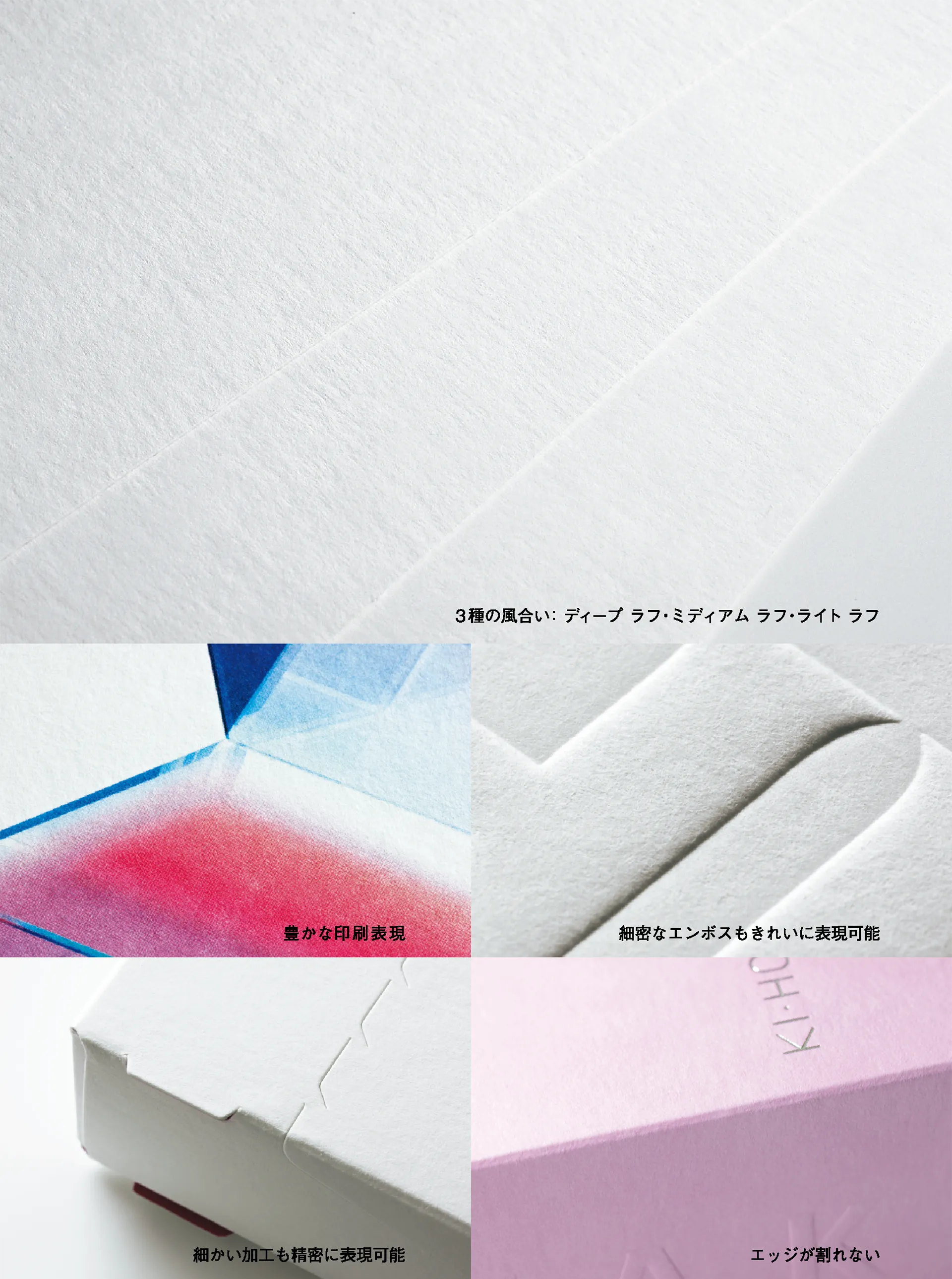塗工品の気包紙Cの高い印刷再現性はもちろん、非塗工品の気包紙Uも風合いを残しながらマットで奥深い印刷表現を可能とします (気包紙Cは片面コートのUV印刷専用紙です)。