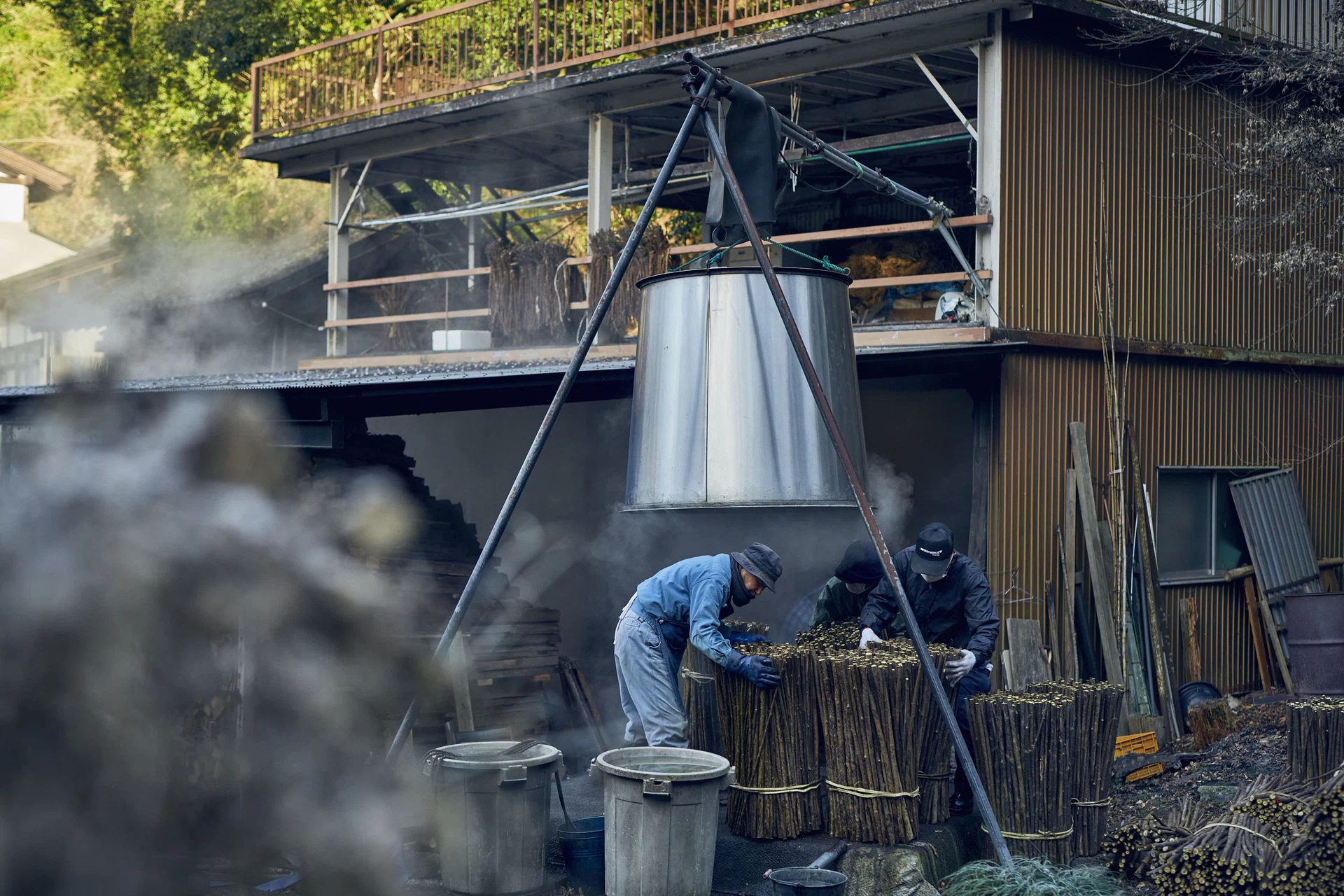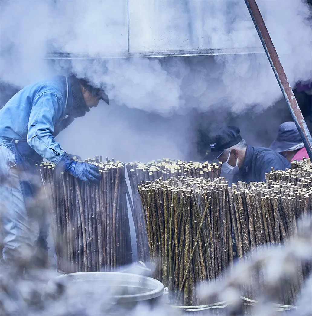 楮蒸しは、 収穫した楮を蒸気で柔らかくする工程。