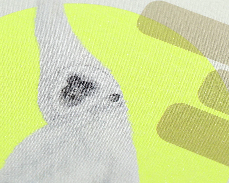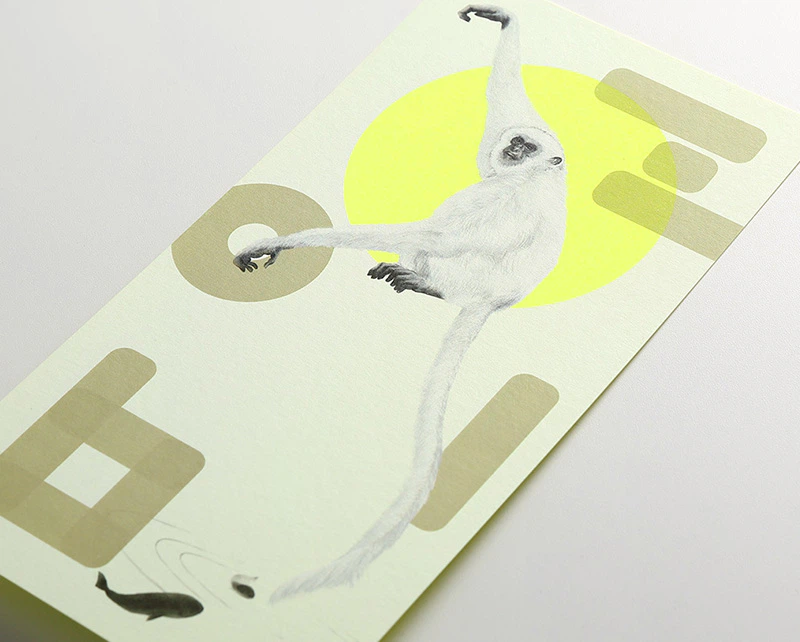 目の眩むような蛍光イエローの「リアクション-FS」に干支の申を日本画風にあしらった、アンバランスさが楽しい年賀状となりました。UV白インクを幾重にも重ね、丸窓に切り抜いて地色を見せることで、鮮やかな紙の魅力を引きだしています。
