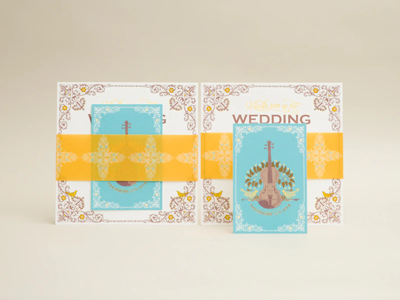 結婚式を挙げられるおふたりから、できるだけ厚みのある紙を使用し高級感を出して欲しいとのご要望があった為、大きなサイズにしても反らない程の厚みがあり、活版印刷との相性が良い「グムンドコットン」をご提案しました。また、返信ハガキには常用している「アラベール」、紙帯には下にずり落ちてきにくくなるよう両面で質感の異なる「はまゆう」を使用しました。(HOZZ WEDDING 保泉 泉さん)
