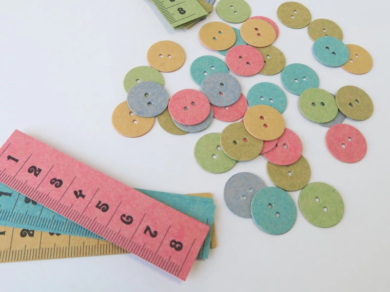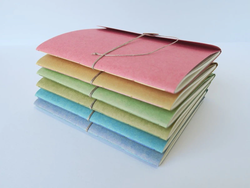 旅ノートの見開きには小さな栞が3枚。定規と旅に役立つ小さなスケール表です。初めと終わりのページにはチケットなどが挟めるポケットを付けました。表紙の色ごとに綴じ糸も変わります。留めボタンは、2色のファーストヴィンテージを合紙して作りました。本文は片面の罫線入り。文字数に関係なく、たくさん書き込めるデザインになっています。(KaoPoK Bookbinding 原田 薫さん)