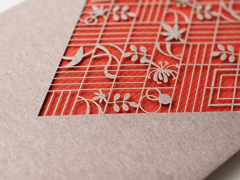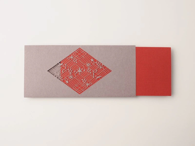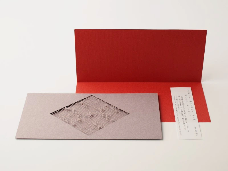 多くの人に親しまれているこの歌は、秋の情景を歌っていますが、ずっと変わらない気持ちを綴った恋の歌でもあります。用紙は色合いで選びました。朱色がかった赤とグレイッシュな紫で、少しもやがかった秋の情景と共に胸に秘めた大人の恋心を表しています。