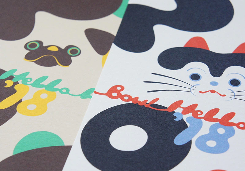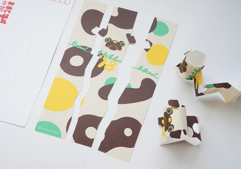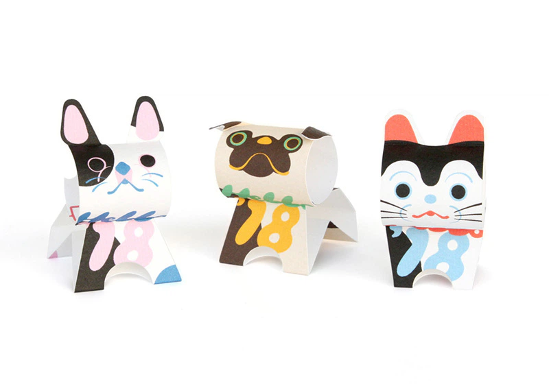 凸凹した素朴な風合いがデザインの雰囲気に合っていることと、組み立てる際に、折ったり丸めたり貼り付けたりするのも問題なくできるのでこの紙を選びました。組み立てると犬張子、パグ、フレンチブルドックになります。