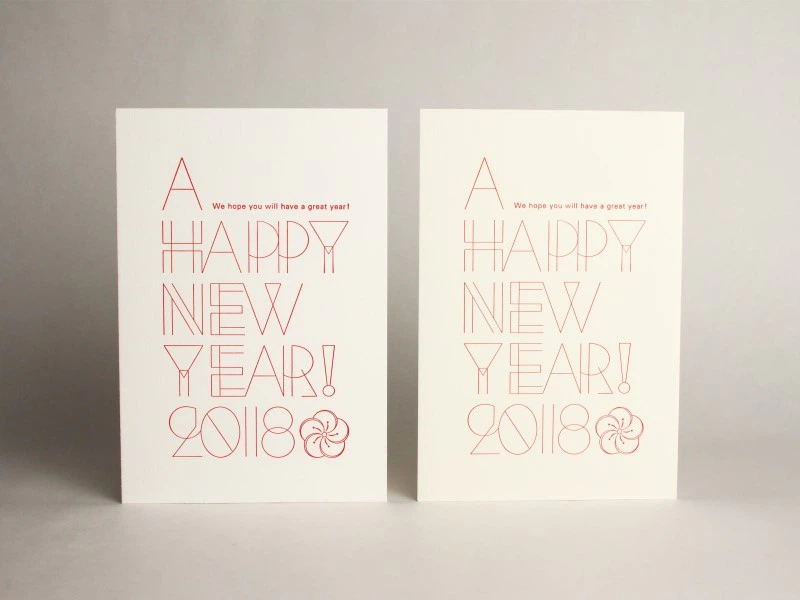 新しい年のご挨拶としてシンプルなものをと考え、白い紙に赤インクが映えるものを検討しました。また、細い線が多いデザインのため、活版で特徴を出すためには紙の柔らかさも必要でした。白色度が高く、厚みと柔らかさの両方を兼ね備えていることから、今回パチカを選びました。パチカは本来加熱によって出る透明感が特徴的な紙ですが、触った時の暖かみも年賀状の挨拶に適していると思いました。