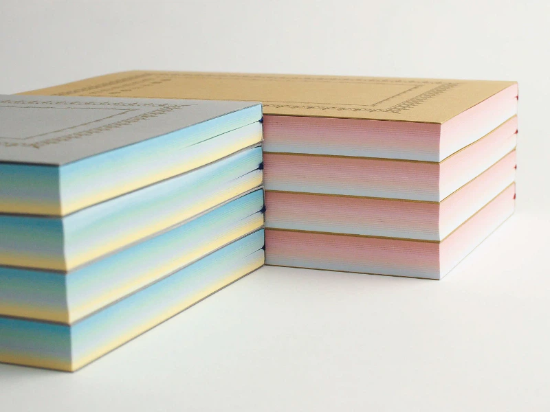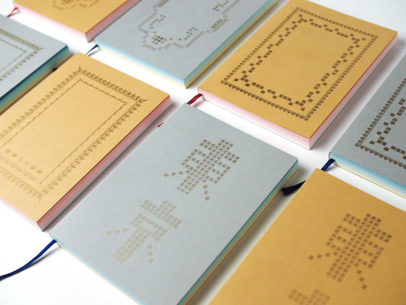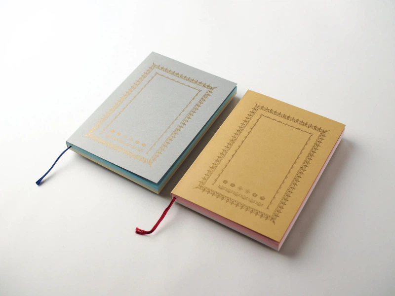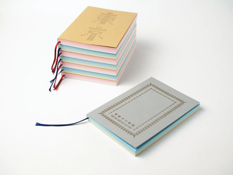 活版TOKYO2018にて、活版印刷をご体験いただくワークショップを行うにあたり、活版印刷の歴史ある雰囲気に合う美篶堂手製本ソフトカバーノートの表紙に、活字の装飾枠を活版印刷することをご提案いたしました。活字の装飾枠を施したノートは、さくら色や空色のグラデーションも相まって、古い文庫本のようであり、また日本の伝統的な雰囲気が感じられる印象深いノートに仕上がります。より文庫本の雰囲気に近づけられるように、活版TOKYOの特注で「スピン」を付けてもらっています。是非活版TOKYOにてワークショプをご体験いただけるとうれしいです。(活版TOKYO運営事務局)