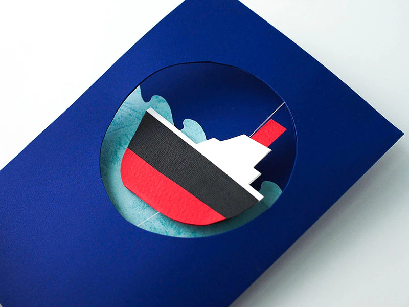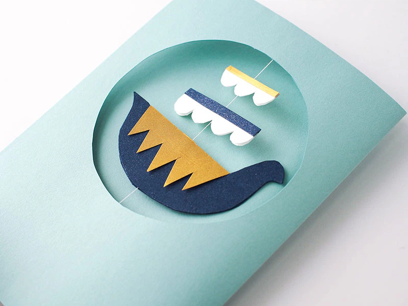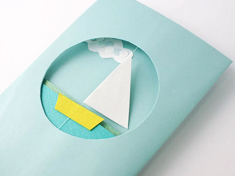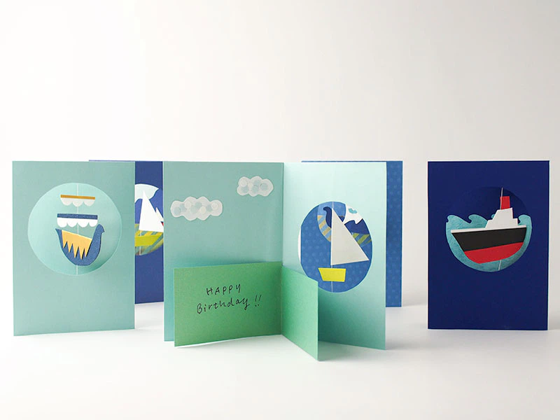 平面になりがちな紙の工作で、空間性や軽やかさが出るといいなと思ったので、「船が糸を軸に回る」作りにしました。出来上がったカードを立てて、風を乗せて、眺める。作った人も、そのカードを受け取った誰かも、みんなくるくる回る紙のモチーフを眺めて、嬉しくなります。そして、いろんな人に見せに行きたくなる。カードって、文字だけでも嬉しいものですが、動きも加わるとさらに伝えたい気持ちが伝わるような気がしますね。ポジティブなコミュニケーションには紙は最適だと思います。