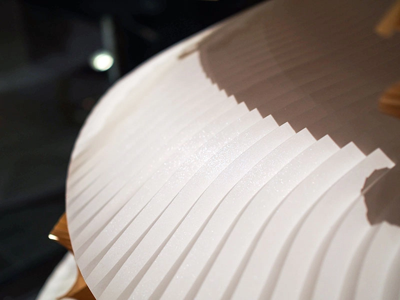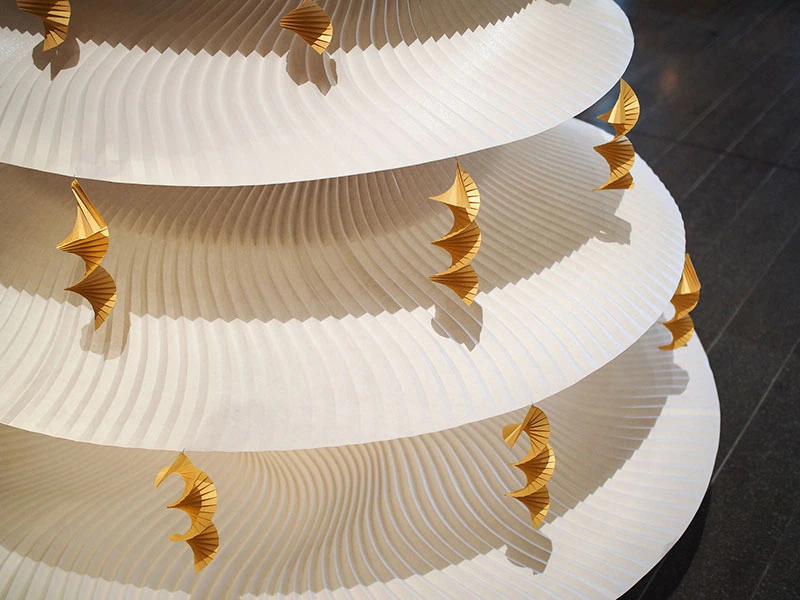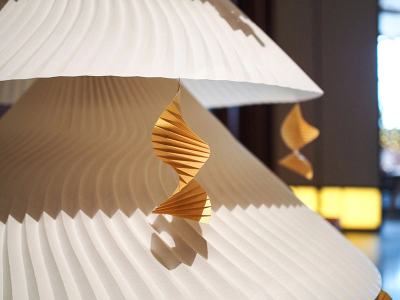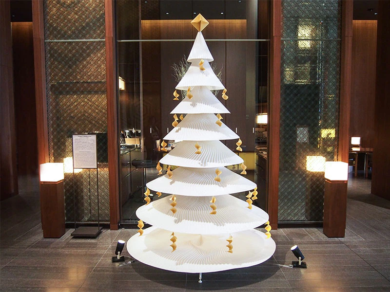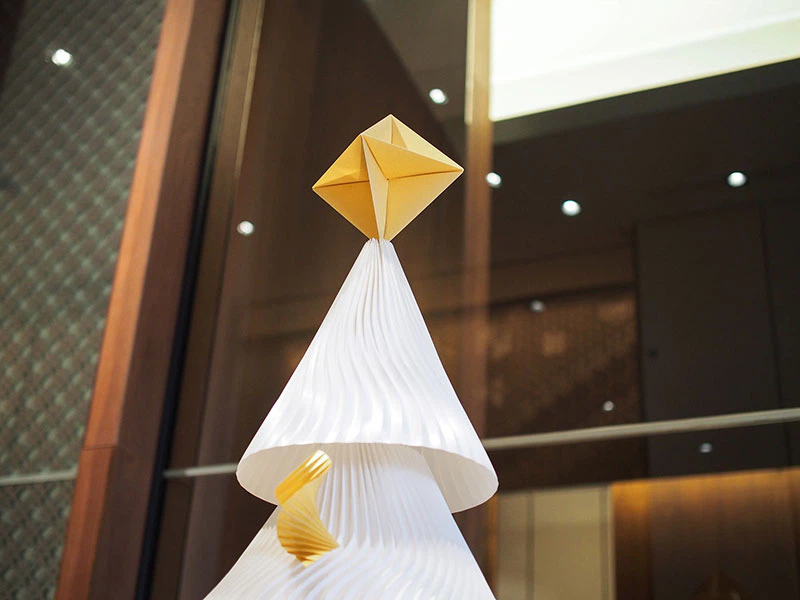 アンダーズ 東京のデザイナーであるトニー・チーが掲げた「Memory-”折り紙”のように折り重なっていく記憶」というコンセプトにインスピレーションを得て「折り紙」をテーマとし、「折りひだ」で記憶の重なりを表現するとともに陰影を生み出しつつ、クリスマスという神聖な日を祝す木を模した造形に表現しました。今回は、クリスマスということで「雪」をテーマに雪に関する銘柄を選び製作し、紙の開発者の雪への思いを一層一層変化を加えて表現しました。(西村優子さん)