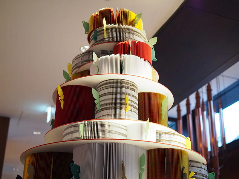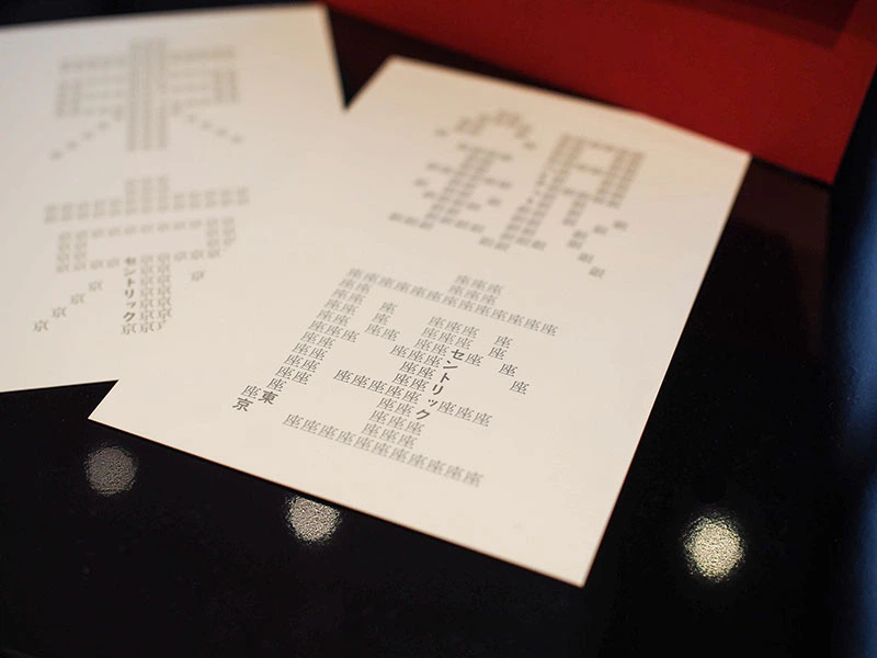 ハイアット セントリック 銀座 東京のイメージの赤と、NTラシャ 濃赤 の相性がよく採用しました。今回のツリーをつないでくれた中村活字さんで、アートディレクター(守田)が初めて作った名刺の紙が竹尾さんの用紙でした。ハイアット セントリック 銀座 東京、中村活字、竹尾の3つをコラボレーションさせることは、アートディレクターにとって活版印刷の原体験につながっていたため、竹尾さんの用紙を使うことにしました。