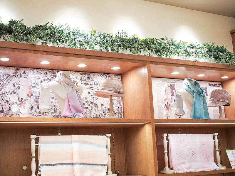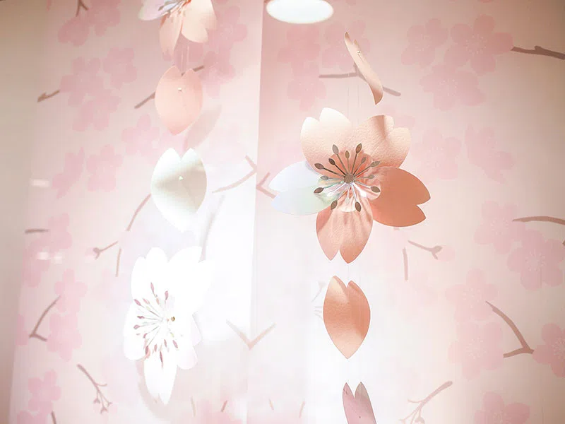 麗らかな春、桜が舞うような動きのあるディスプレイを表現したかったので、立体感と奥行きのある「ハンマートーンGA ばら」、なめらかで春らしい「OK ACカード うす桃」、二つの中間色で柔らかさを感じる「色上質 コスモス」を選びました。