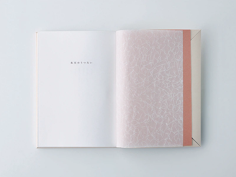 私が装幀をした『水天のうつろい』は、著者の岡田ユアンが自身の子供をうみ出す前後の時間を綴った詩集である。「水天」は仏教における水の神様で、日本では安産・子授けの神様として知られている。詩集の表紙は、永遠の時を持つ宇宙に一筋の水が流れ新たな時間が始まることを示唆している。ファインペーパー い織りの静かな和のテクスチャーが、ブロンズインクで刷られた水面に浮かび上がり、スモークホワイトの偏りのないニュートラルな色調が空間を際立たせる。新しくうみ出された言葉たちを、フランス装に想を得た繊細な造本で包んだ。(長澤昌彦さん)