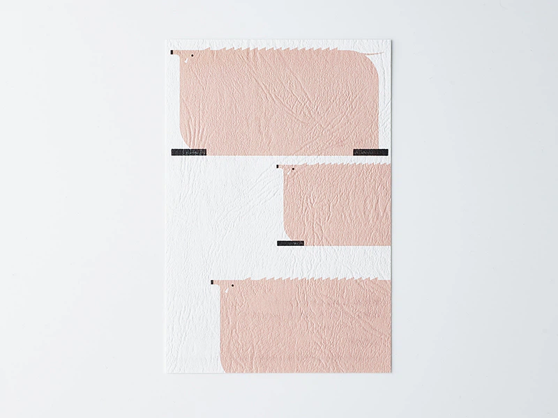 自社年賀状には毎年「アラベール」を使っていましたが、2019年は新鮮な気持ちで「レザック66」使いました。年賀状はとても小さい印刷物なので、全紙に面付され裁断された「レザック66」のテクスチャーは1枚1枚異なります。そこにどんな色面が走っていたらかわいい印刷物になるか考えて作りました。(長澤昌彦さん)