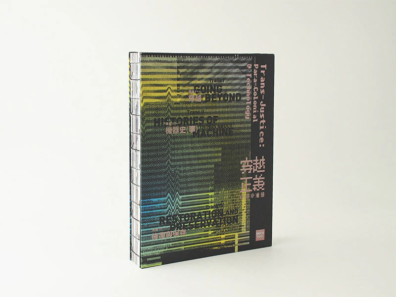我一直很喜歡蒝織紙密度很高、細看很錯綜複雜的紋理,而且印刷深色的效果也很好。因為這一本書的主題與科技感有關,但是要描述的並非是科技的美好前衛,反而要傳達的是展覽中,由科技主題延伸出的七大理念,並且讓七大理念隱晦地貫穿在封面繁複的雜訊之中,因此我選擇用有交錯網狀紋理的蒝織紙,「紙的紋理」與「雜訊的紋理」,兩者交互在封面上,產生第三種肉眼很難對焦的複雜紋路。讀者拿起這本書時,不只是視覺上看到錯綜難辨的封面紋路,手上也可以感覺得到蒝織紙密度很高的交錯感。
