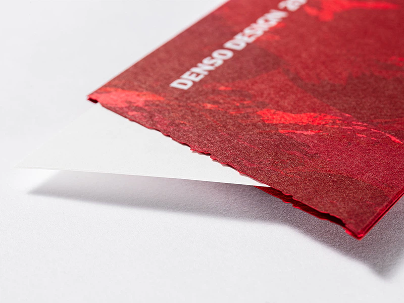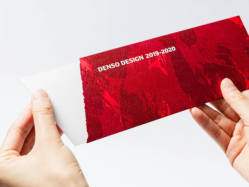 スリーブは赤のマーメイドと赤系の三つの特色インキを重ねて、モノづくりの熱量や深みを表現し、さらに開口部の波打った裁ち落としで、情熱がにじみ出るさまを表しました。対照的に、中のカードは透明箔と気包紙の組み合わせでシンプルに仕立てています。(株式会社デンソー デザイン部 秋山さん)
