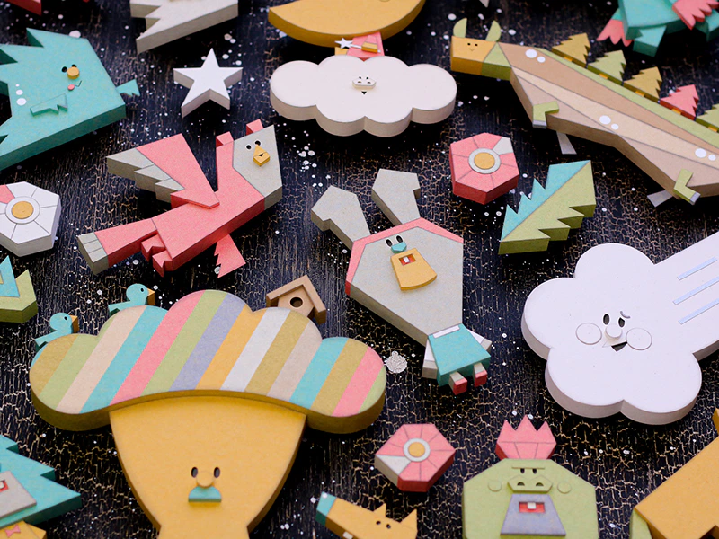ファーストヴィンテージの色合いと質感が、ポップなキャラクターたちを落ち着いた雰囲気に見せてくれます。紙のフチにパステルを塗っていますが、馴染みがよく相性も抜群です。イヤリングなどのアクセサリーには、高級感と存在感のある新だん紙 きららとスタードリーム-FSを使用しました。マーメイドやタントは色数と厚みが豊富で、カットや接着、丸みを付ける加工がとてもしやすく、万能です。(松本康孝さん)