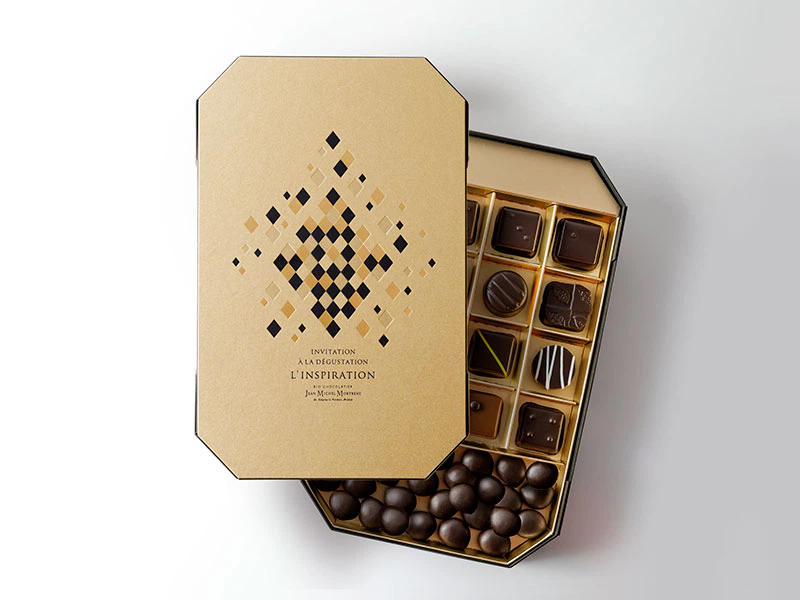 「JEAN MICHEL MORTREAU」(以下、JMM)はオーガニックショコラに情熱を捧げる、ジャン=ミッシェル・モルトローのチョコレートブランドです。 オーガニック農家で育ち、「オーガニックであることが、あたりまえ」と考え、自らカカオ産地の開拓まで携わっているジャン=ミッシェル・モルトローのつくる“世界でいちばんやさしいショコラ”。 一方、工場に隣接するマングファル川を水資源とし、伝統とエネルギー再生を軸に作られ、世界中のデザイナーの感性に響きを与える、グムンド社の紙。 それぞれの生みだす製品のクオリティはもとより、自然をリスペクトする精神、そして、ものづくりの姿勢は非常にシンクロしていることに気が付きました。JMMのショコラを、GMUNDの紙で包むことは、唯一無二の組み合わせだと感じています。 中でも「L' INSPIRATION(ランスピラシオン)」はJMMの主要なラインナップをそろえたアソートです。 グムンドゴールド-FSの洗練されたゴールドの色合いはギフトとしての特別感のなかに、JMMのショコラの誠実な味わいを、そして、手で触れたときの質感は、JMMのショコラのやさしさが表現されています。 また、このパッケージの印刷、加工など全工程はGMUNDの紙の特性、そしてJMMのショコラの魅力を熟知した職人、たった一人の手で作られています。(門出 希さん)