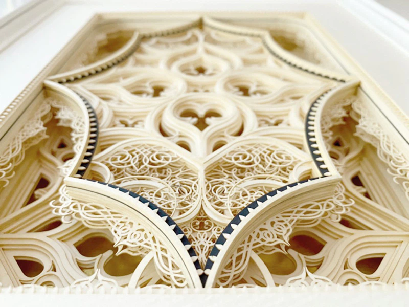 紙を幾重にも重ねて彫り、彫刻のような作品を制作されている輿石孝志さんにご用途をおしえていただきました。
