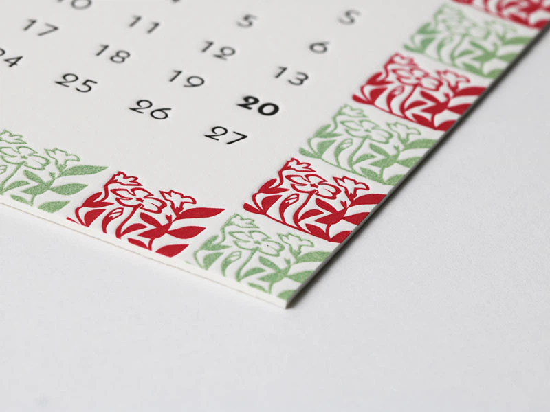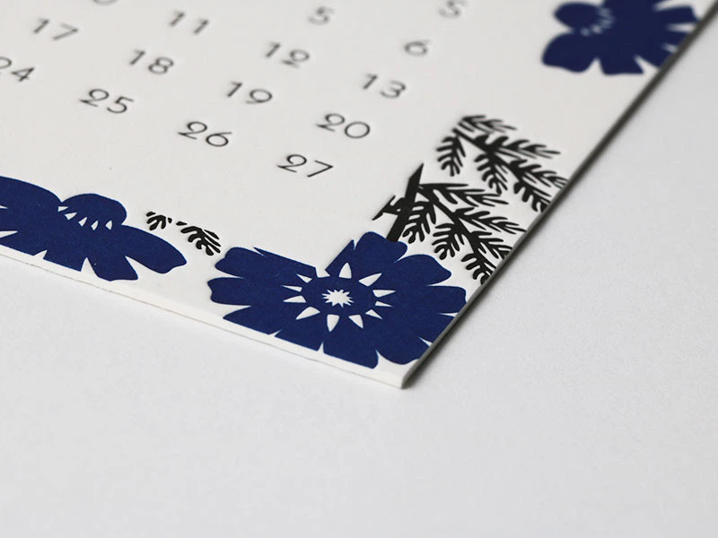 スノーブル-FSの雪のような白さはまっさらなキャンパスのようであり、且つ発色性も大変高い為、現代的な活版印刷におけるグラフィックデザインになくてはならない存在です。季節の移り変わりを楽しめるカラフルなカレンダーを活版印刷で表現するにあたり、スノーブル-FSが最適だと判断致しました。適度な厚みには綺麗に印圧がかかり、特に数字等の文字は大変くっきりと判読しやすいです。