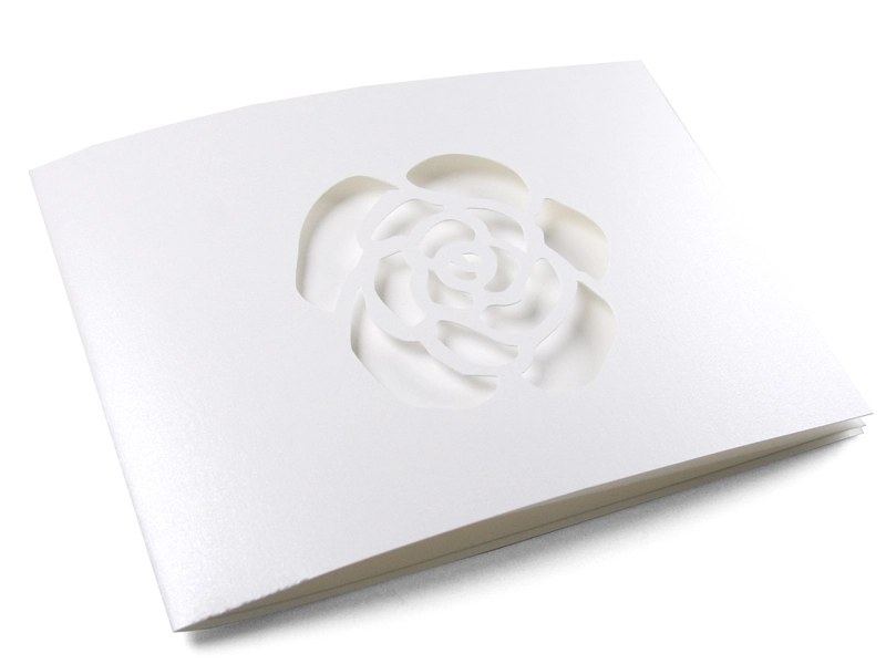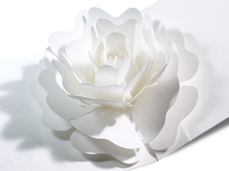 花のポップアップグリーティングカード〈カメリア〉は35個の紙のパーツを組み合わせて、カメリアの花を表現しています。接着剤等は使用せず、紙の組み合わせのみでポップアップカードを作成するため、適度なしなやかさと強度のあるアラベール-FSが大変適していました。カードの台紙には上品な光沢のあるペルーラを使用し、カメリアをモチーフにした切り絵を施しています。(PAPER & ARTS 三好祐一さん)
