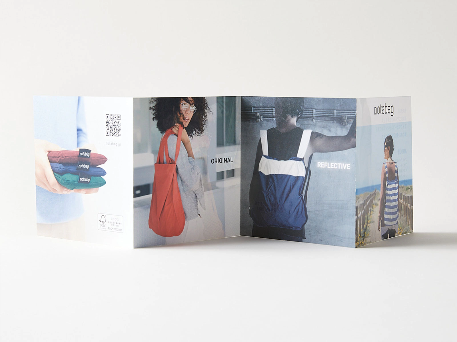 環境にやさしいデザインプロダクトを表現するため、エムティーエープラス-FSを選びました。Notabag(ノットアバッグ)は実用性とシンプルな美しさを追求した日常使いの商品です。またデザインを通して環境配慮の意識を広めることを目的としています。そこでリーフレットはFSC®森林認証紙を採用することにしました。美しい紙であること、日用品のリーフレットとして使いやすい価格帯であることも条件でした。エムティーエープラス-FSはそれらすべてを叶えてくれました。(山本真由さん)