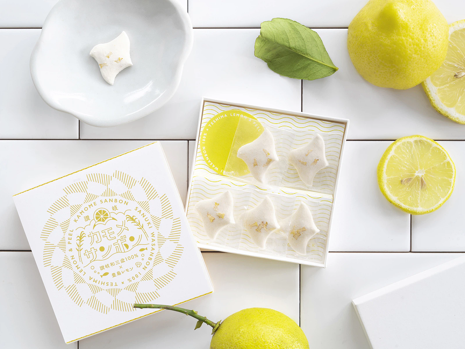 湧水に恵まれた島、豊島のレモンを使った和三盆「カモメサンボン」のパッケージに、フルート部分がレモンの断面や波を連想させることと、薄いお干菓子を守ためのクッション性にも優れた、ファインフルートを選ばせていただきました。ファインフルートのスリーブは、段ボールに入ったレモンのイメージと重ねることで、産地直送の風味豊かなイメージを表現しています。組箱はギフトボックスとして再利用したくなるような、真っ白な気包紙 U-FSを使用。