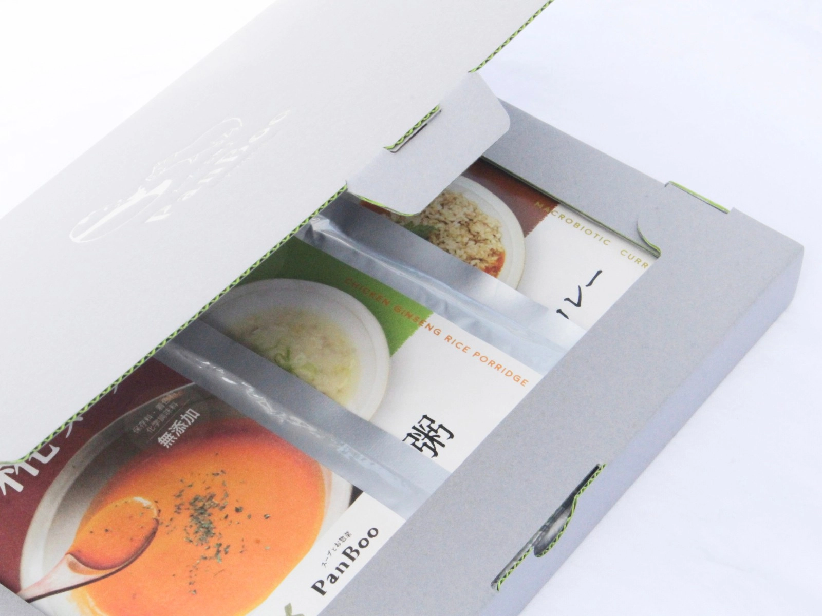 以前より弊社のレトルトスープをギフトとしてお使いいただく機会がよくあり、より洗練されたギフトにすべくオリジナルギフトボックスの制作に着手しました。たくさんの色を組み合わせられることと、エコの観点から少ない資材でのギフトパッケージを実現するために、竹尾さんに親身に相談に乗っていただきファインフルートを選びました。用途を選ばずシンプルなグレーをベースに、お店のイメージカラーの緑を差し色にし、お店のロゴは箔押しにして高級感を表現しました。(井上沙織さん)