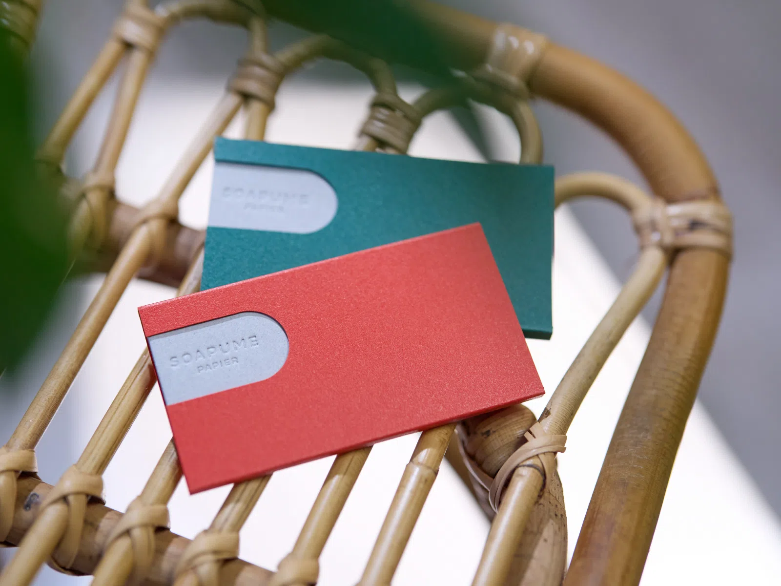 SOAPUME PAPIER(ソピューム パピエ)は「香り」にこだわった紙石鹸です。中身の紙石鹸は老舗の和紙メーカーによる製作で、中身だけでなくパッケージも出来るだけ「紙」を使用できればと思い実現したパッケージです。スライド式の「身」の部分はチップボールをビク抜きしたものを合紙し、断裁することによって、しっかりと厚さのあるパーツにすることができました。スリーブには独特の手触り感のあるサガンGAを使用し、形状はシンプルでモダンな佇まいでありながら、色彩や触感によって優しさや温もりを感じさせることを意図し、制作したパッケージです。(石田清志さん)