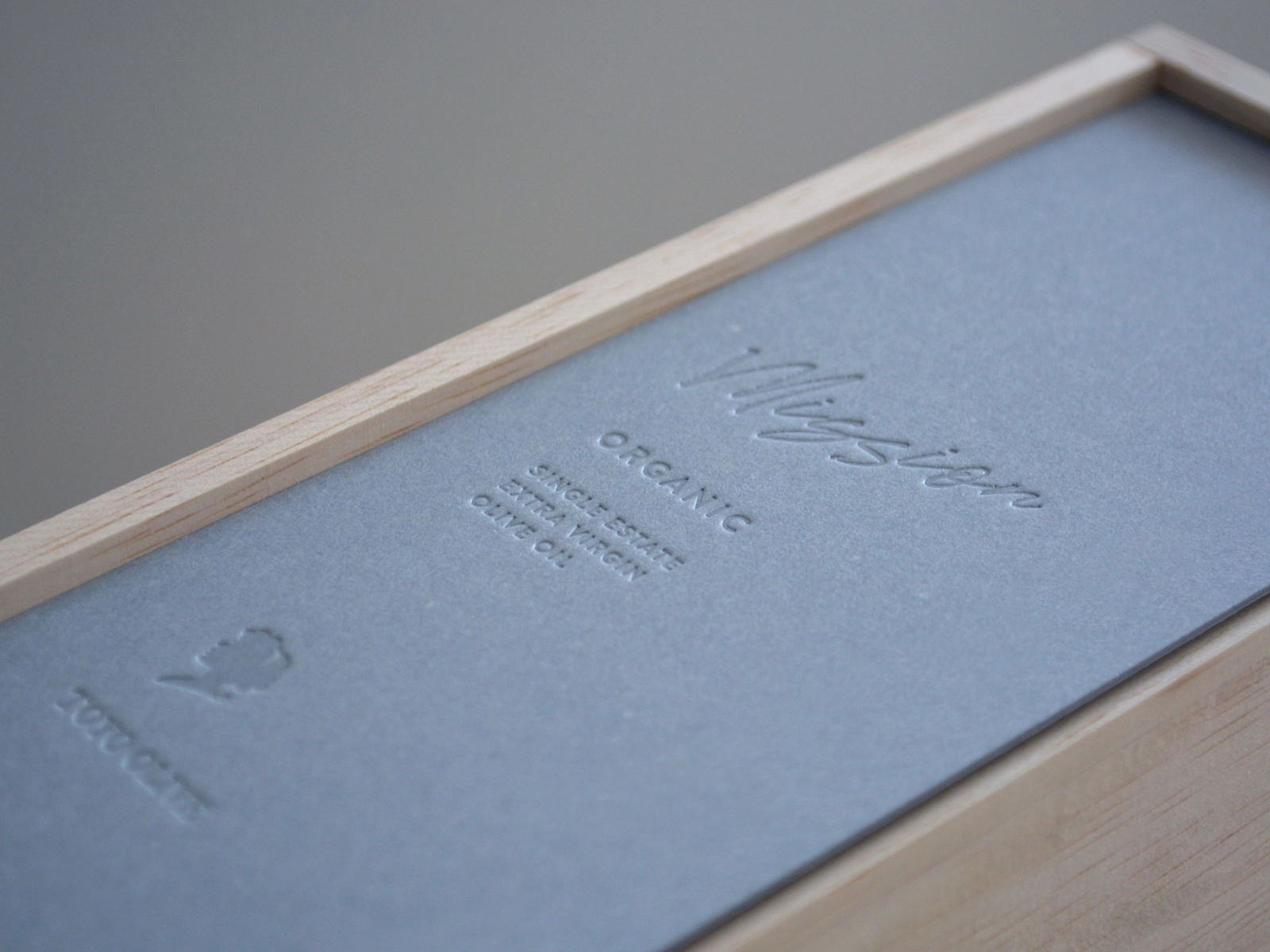 小豆島で循環型 有機栽培に取り組まれ、有機認証を受けた限られた区域の実から採る希少なオリーブオイル。このオイルの特別さや鮮度・美味しさのための背景を伺いながら打ち合わせを重ね「外装には木箱を」と方向性が決まりました。そこから仕様を具体的に固めていくなかで、大切な贈り物や自分へのご褒美として特別感のある佇まいだけでなく、循環型 有機栽培の土づくりにかかった年月や、小豆島という風土、海、風、季節や天気、そこでオリーブオイル作りに携わる方々の人柄なども込められないかと試したなかで、木製の身箱に「GAファイル ブルージーン」の蓋という素材違いの組み合わせがとてもしっくりくると感じ、ご提案しました。