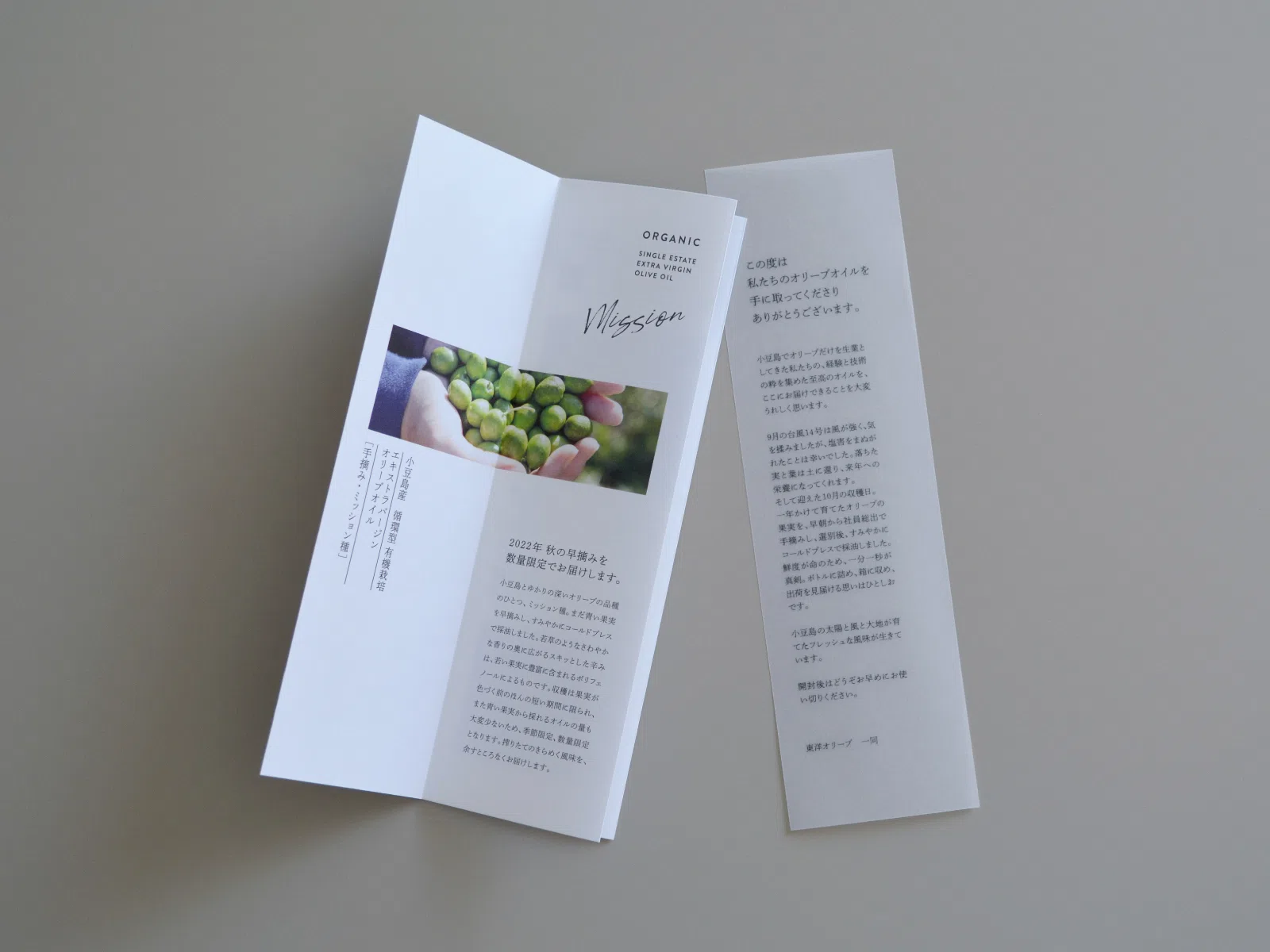 木箱を包むスリーブは、初見の印象を決める大切な素材なので、白さの質が高く、風合いが上品で存在感もあり、かつ強度・汚れにくさも兼ねそなえた「気包紙 C-FS ディープ ラフ」を。製品の案内栞にはオリーブやレシピの料理・海の色が綺麗に映えるまっすぐな白さと印刷の安定感、手触り・風合い・高級感もある「アラベール-FS スノーホワイト」。収穫期を迎えた東洋オリーブさんからの挨拶状は、手に取ったとき優しく芯のある「XDTトレーシング-FS クリアホワイト」を選びました。(シナモンさん)