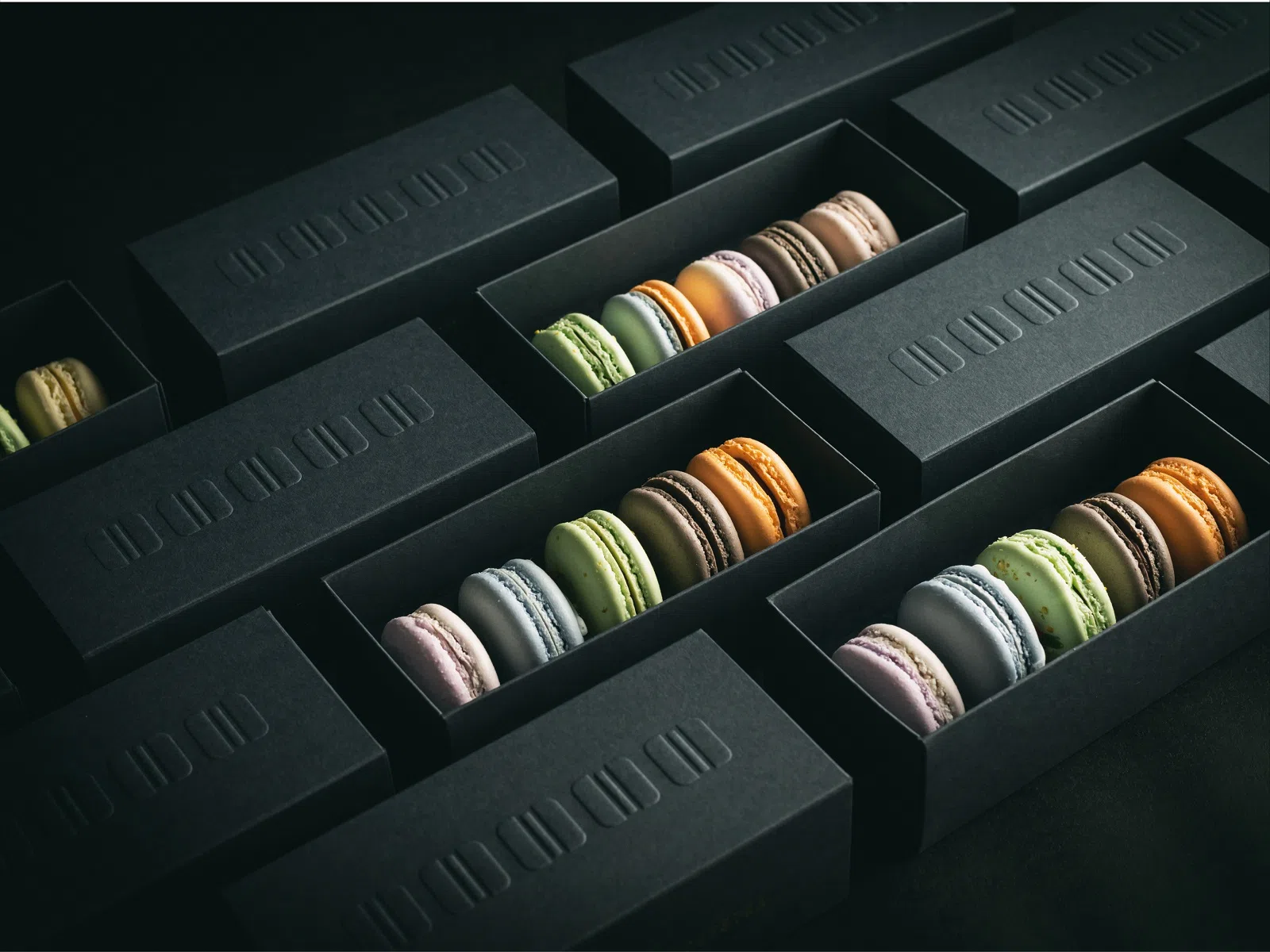 使用した用紙は「カラープラン-FS」。しっかりとした厚みがあるため、アトリエでも嵩張らない組箱でありながら存在感は抜群です。また、断面の色も美しく、スリーブ側も高級感のある仕上がりとなりました。デザインは箔押しとエンボスで表現していますが、「カラープラン-FS」のスムースな風合いが加工に上品なコントラストを生み、ブランドの凛とした世界観を表現することができたと感じています。カラーは、色とりどりのマカロンが引き立つように、モノトーンの「スレートグレー」を選択。ダークグレーよりもシックで、ブラックよりもやわらかな「スレートグレー」は、他の用紙にはなかなかない魅力的な色味なのでとても気に入っています。(髙橋柚実さん)
