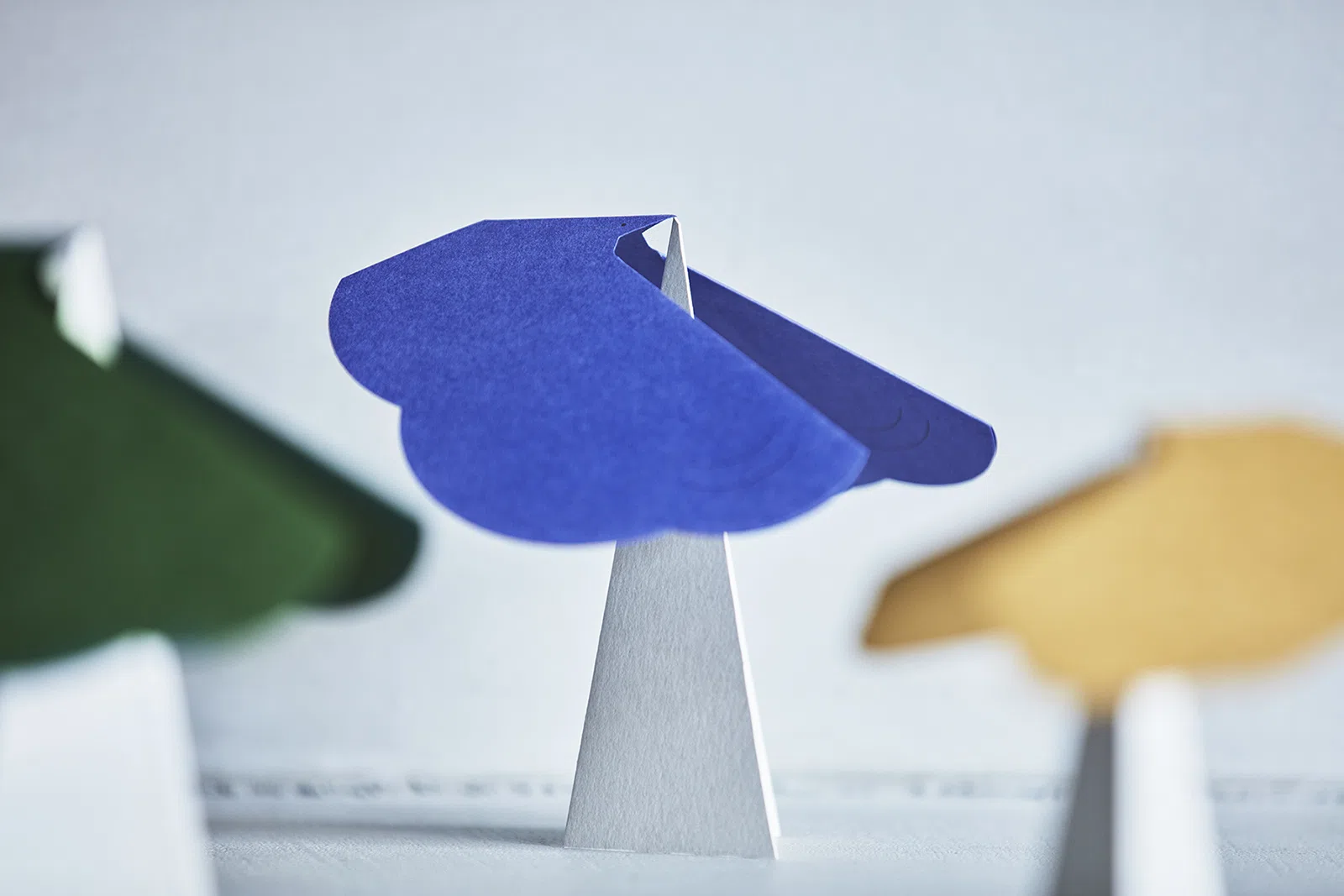 「ビオトープGA-FS」の深みのある色合いとやわらかな風合いが、鳥の表現にとても好ましいと思いました。また、鳥を軽やかな印象にしたいと思っていたところ、「ビオトープGA-FS」は幅広い連量展開があるので、薄めの連量が選べたことも良かったです。個人的には「ビオトープGA-FS マゼランブルー」の深くて鮮やかな鳥がお気に入りです。(靎沢咲子さん)