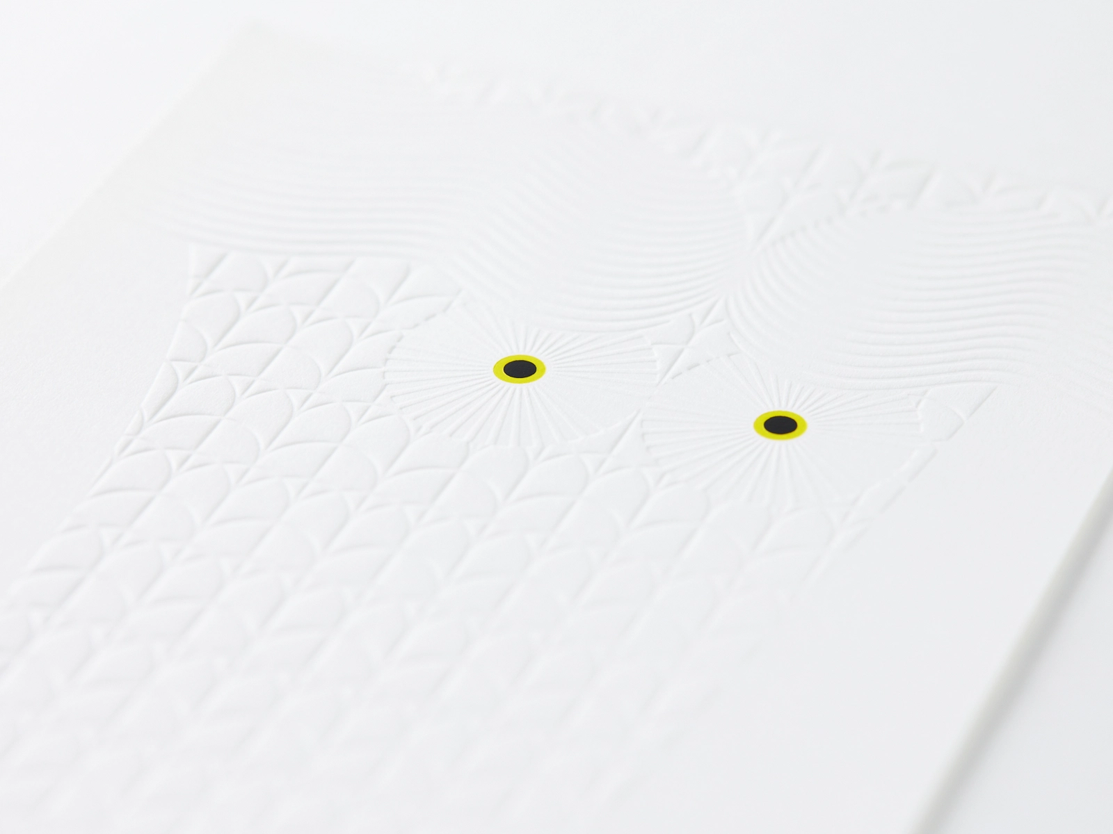 エンボスの生み出す陰影によって浮かび上がる辰に、目の部分のみ黒と黄2種の箔押しを重ね、印象的に表現しています。