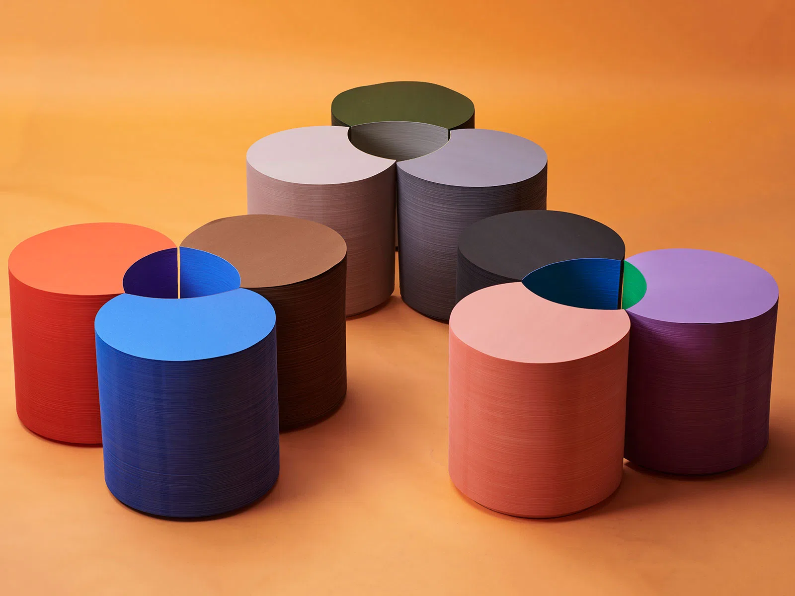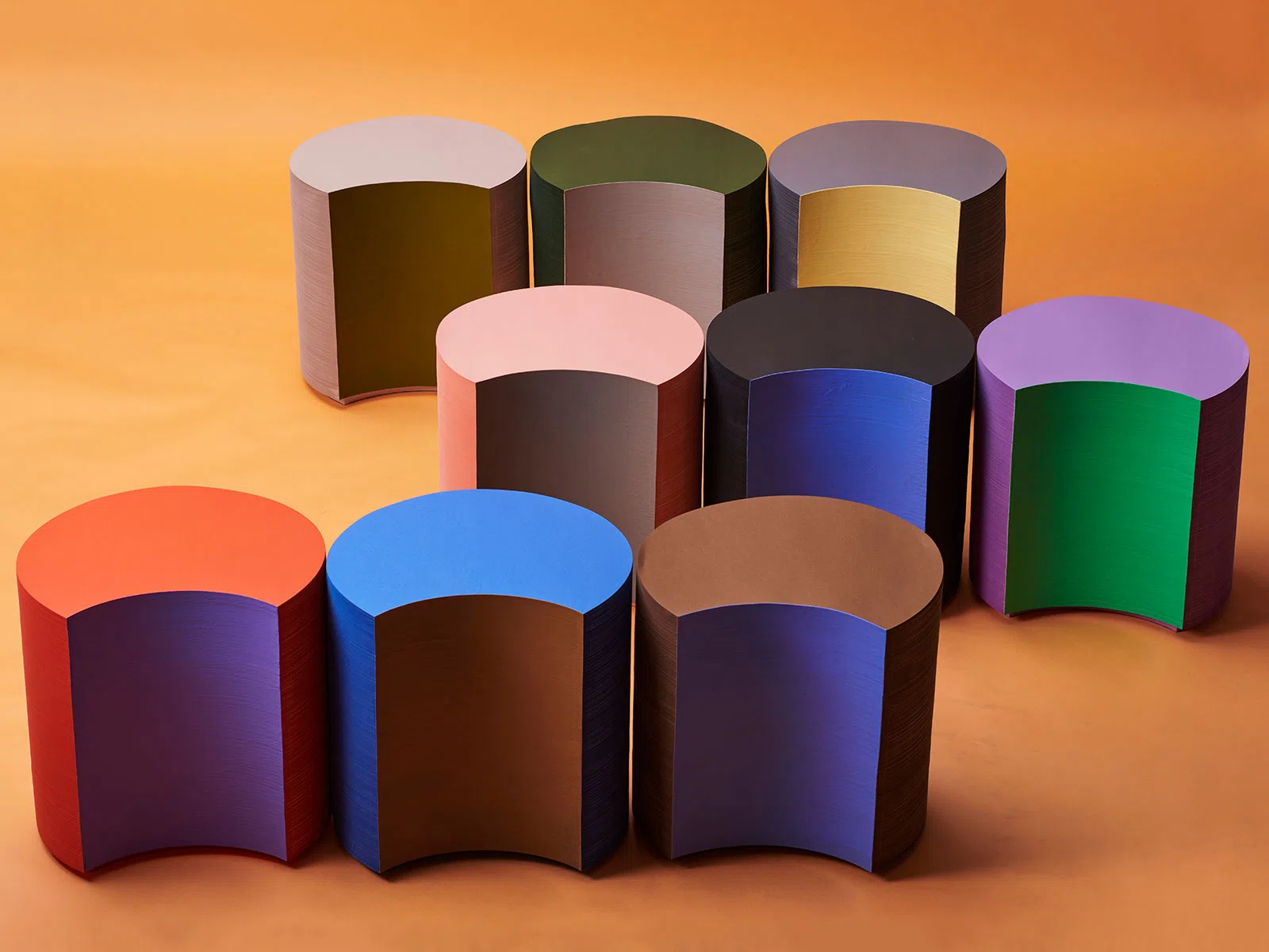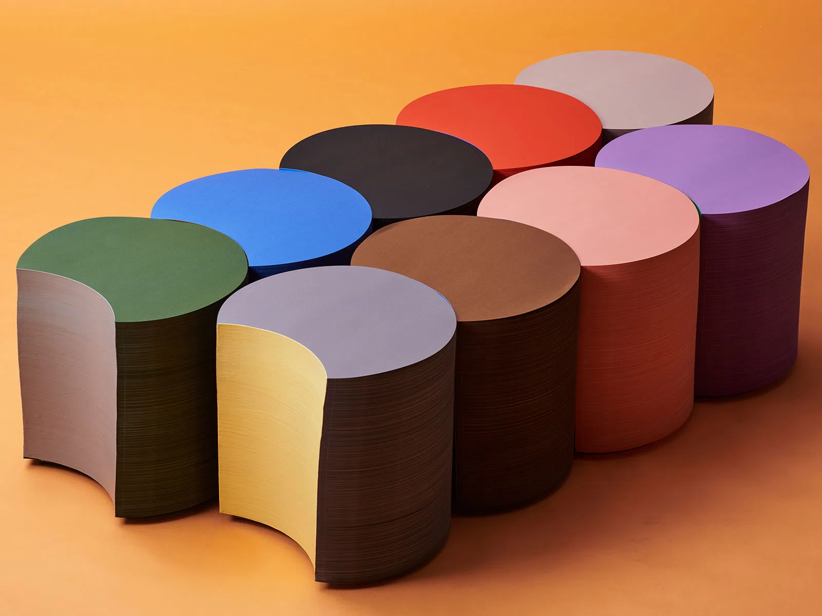 「PAPELITH(ペパリス)」は、敢えて用途を明示しない紙の積層でできたプロダクトです(椅子にもテーブルにもインテリアにも、おもちゃにもなる)。「NTラシャ」の紙色の力強さと手に触れたときのしなやかさに惹かれ、さまざまな空間に置けるよう3つずつ並べた際のテーマカラー(ポップ、シック、ナチュラル)に合う色をセレクトしています。(吉永久美子さん)
