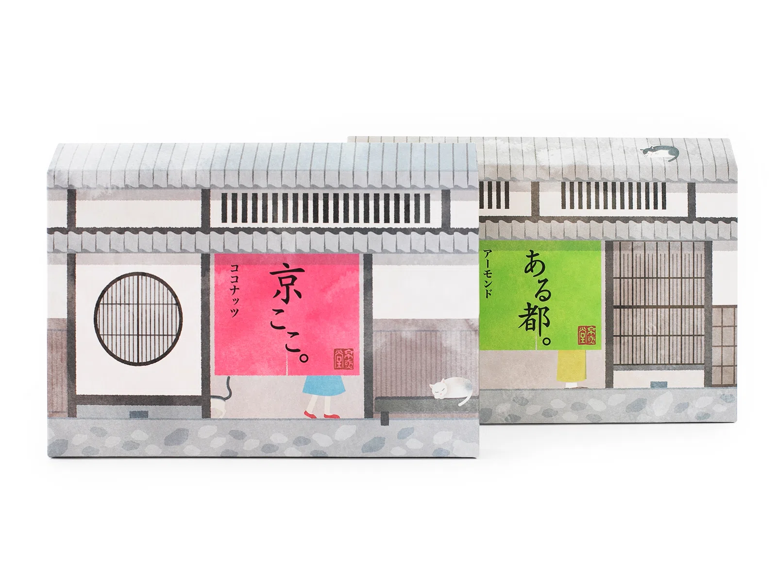 コロナ禍で京都への観光客が激減する中、京都・祇園の老舗菓子店 京煎堂様が開発した洋風焼き菓子のパッケージです。「京ここ。」と、その姉妹商品となる「ある都。」を他商品と異なるパッケージにしたいとのご依頼でデザインしました。