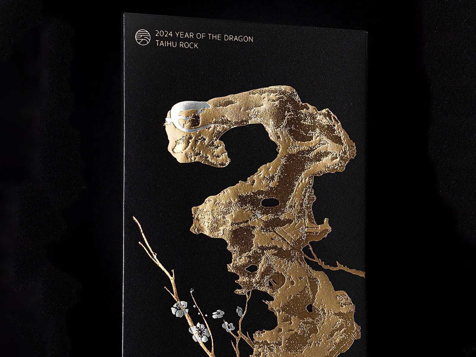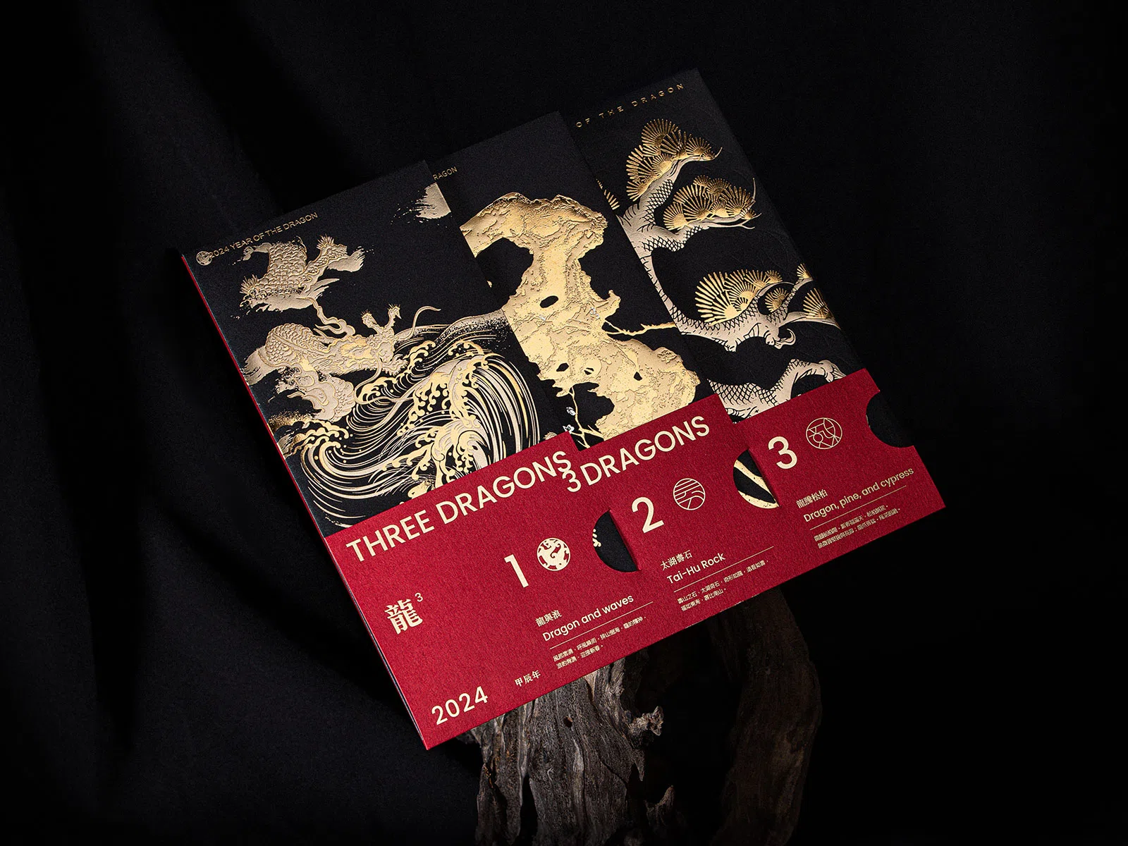 龍は実在しませんが、古来より人々から龍への畏敬の念は絶えることなく、その姿を自然へと投影してきました。風を呼び雨を降らせる海龍、山々を流れる龍脈を表す寿石、龍のような造形の松の幹という3種の龍のイメージを選び、現代の箔押しの技術、「紅包袋」を送る新年の習慣と融合させました。
