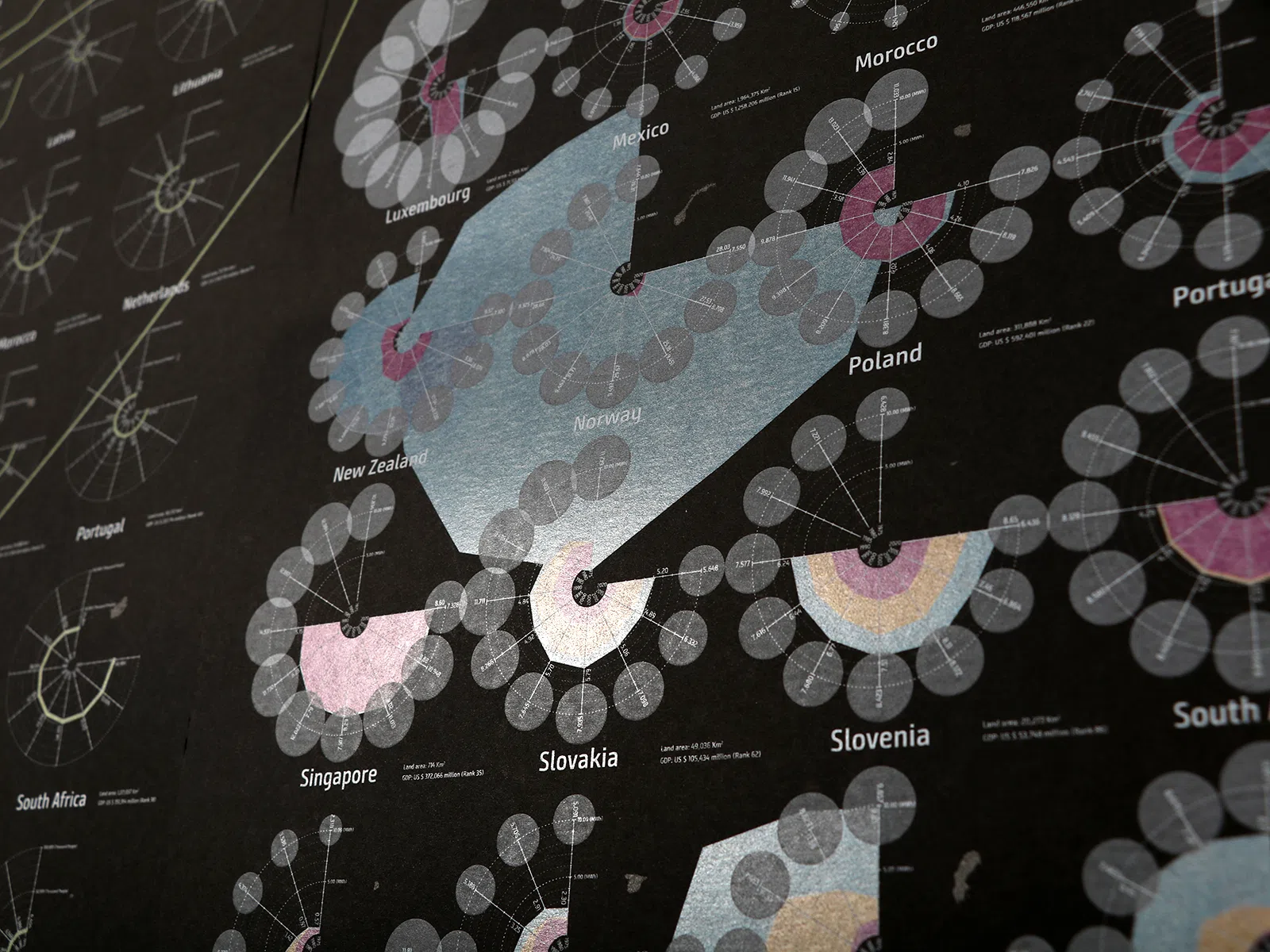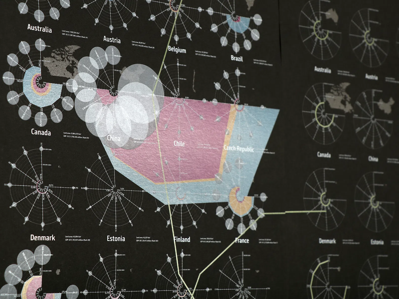IEA (International Energy Agency) に情報を公開している国に限定し、1975年から2020年までの化石燃料、原子力、再生可能エネルギー、それぞれの発電量と、CO₂の排出量を5年ごとに集計し、一望できるよう視覚化しました(1枚目左)。加えて、各国の人口の推移(1枚目中央)から一人当たりの電力消費量、CO₂排出量のグラフを作成し(1枚目右)、環境問題を国単位ではなく、個人単位で見ることで、新しい発見があればとダイアグラムポスターを制作しました。