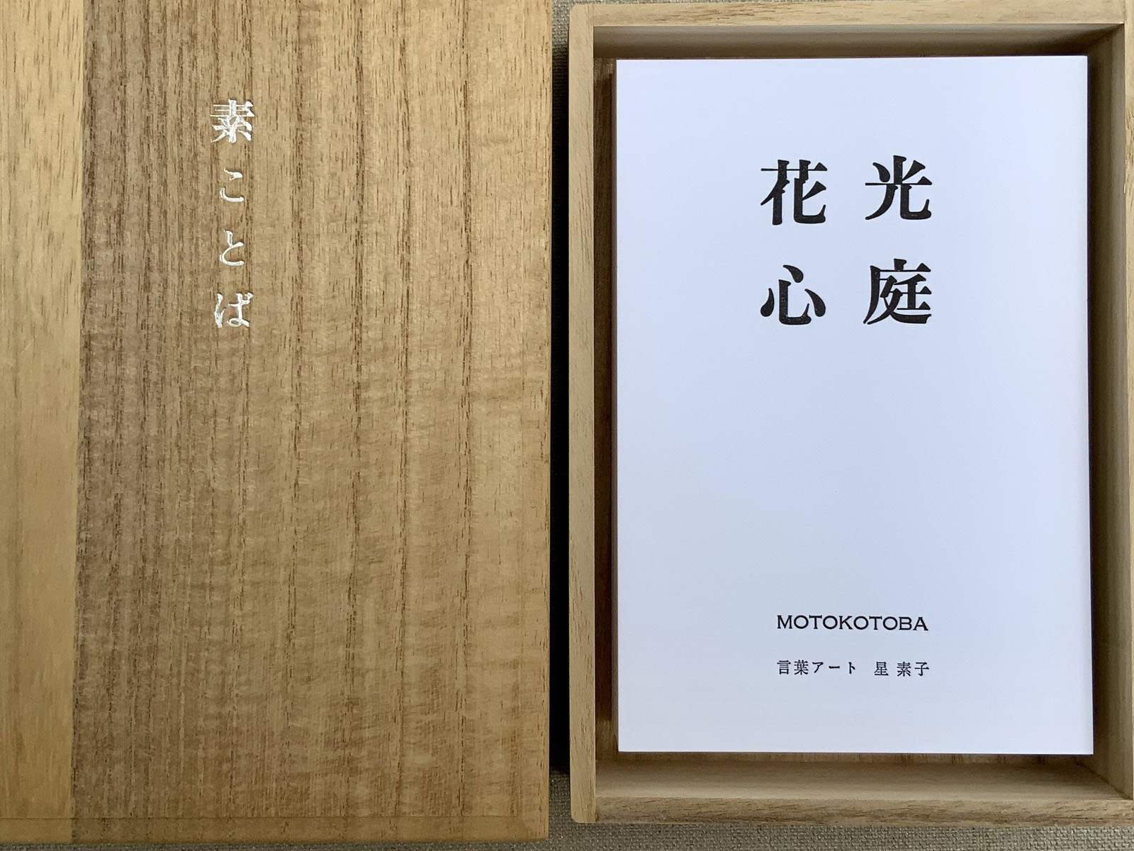 言葉にするとこぼれおちてしまいそうな多様なイメージをすくいあげるように、循環する詩型をもちいた言葉アート「素ことば」(視覚詩・コンセプチュアルアート)を開発して、それを軸に探求・開拓したアート活動を長年おこなっています。素ことばは読み方や見方を限定していないため意味を決めつけることなく対面する人の経験や記憶、感受性などによって「縦・横・斜め…」と自由に想像を広げたり、思いを馳せたりしてお楽しみいただけます。
