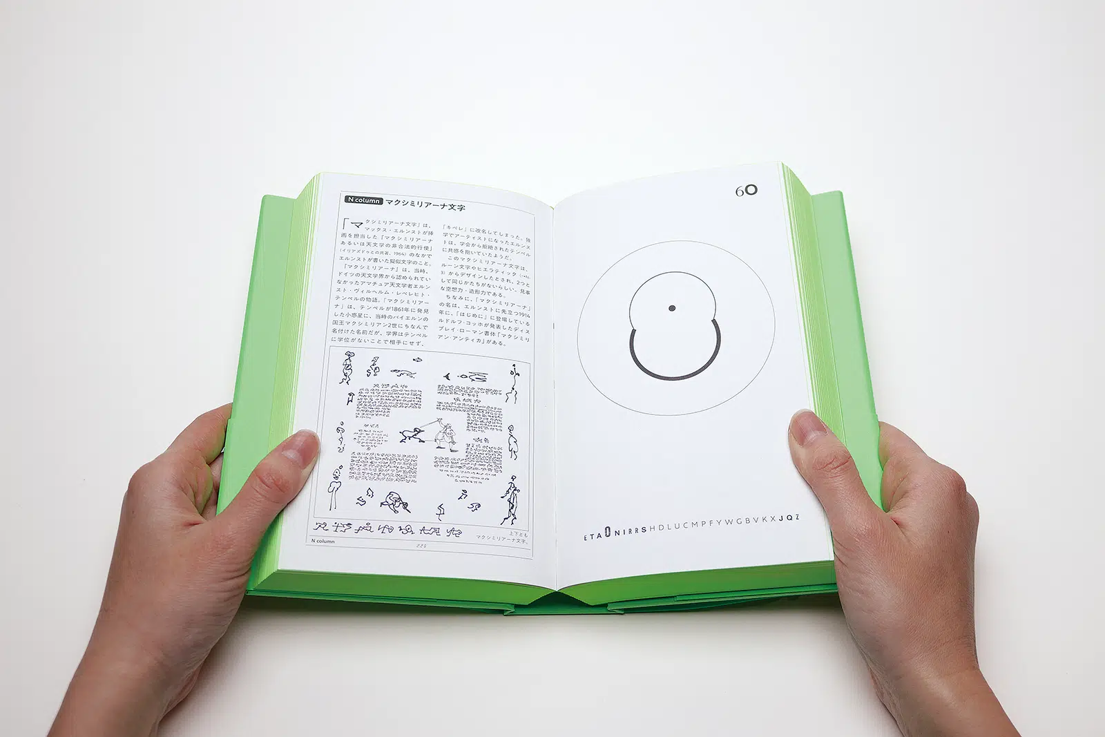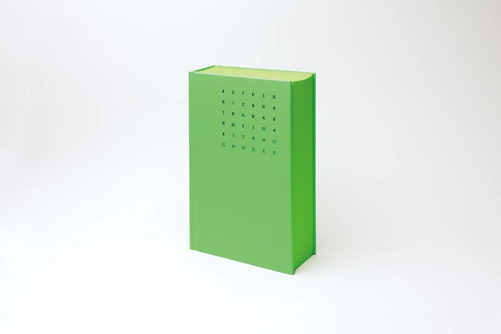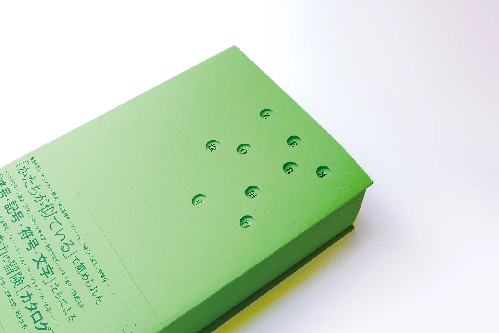 ぼくは蛍光色が好きで、比較的リーズナブルで使い勝手のよいタントの蛍光色シリーズを愛好しています。なかでも蛍光グリーン「タント I-62」は好きです。この『ZERRO 増補新装版』は、束幅もあるので、カラーバス効果、つまり色を浴びる体験を効果的に展開できそうな本でした。そこで、カバー、表紙、見返しなど本文以外の紙をすべて、この「タント I-62」にし、天地・小口の三方にも同じような蛍光グリーンを塗って、本全体が色の発光体のように見えることをめざしました。いいかえれば、蛍光グリーンで塗られたオブジェのような「本」といえるかもしれません。(松田行正さん)